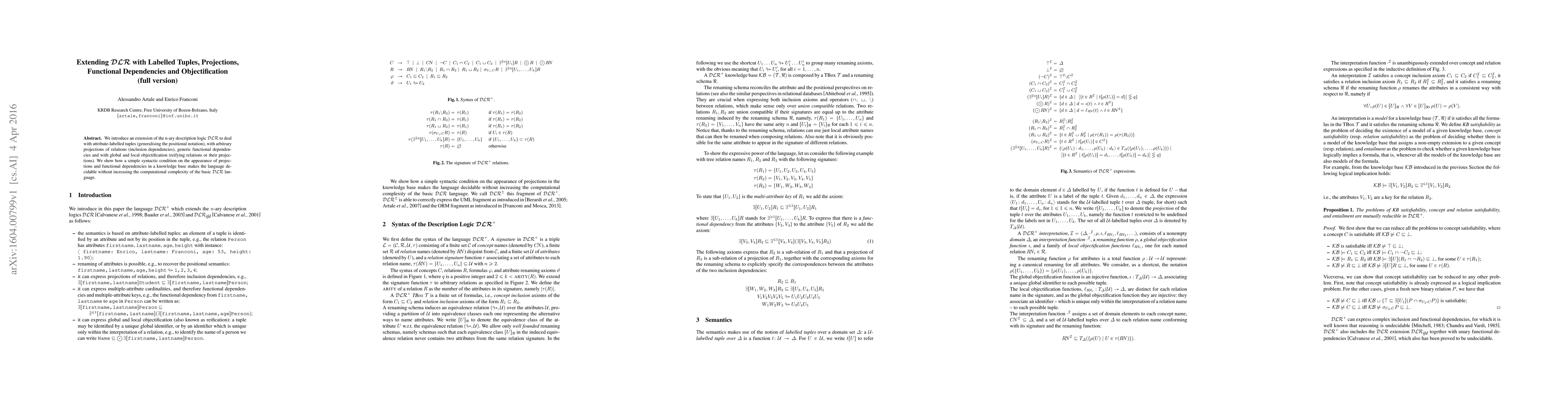 This research paper extends a description logic language to handle attribute-labelled tuples, projections, functional dependencies, and objectification, making the language decidable with a simple syntactic condition.