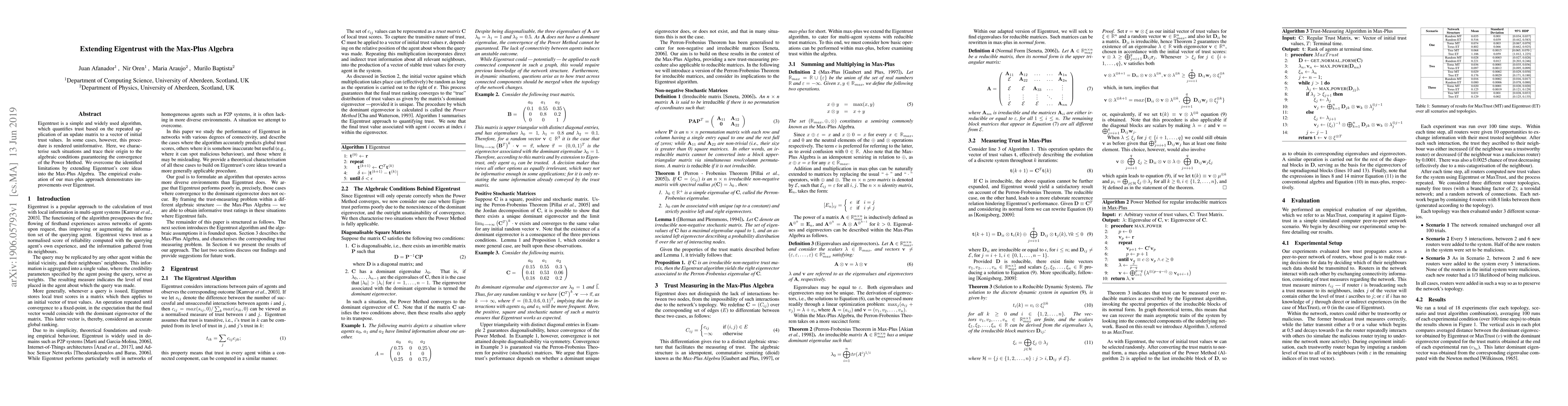 The research extends Eigentrust by incorporating the Max-Plus Algebra to overcome its limitations in certain algebraic conditions guaranteeing convergence of the Power Method. It introduces MaxTrust, an adaptation of Eigentrust using the Max-Plus Algebra, which is applicable to reducible matrices.