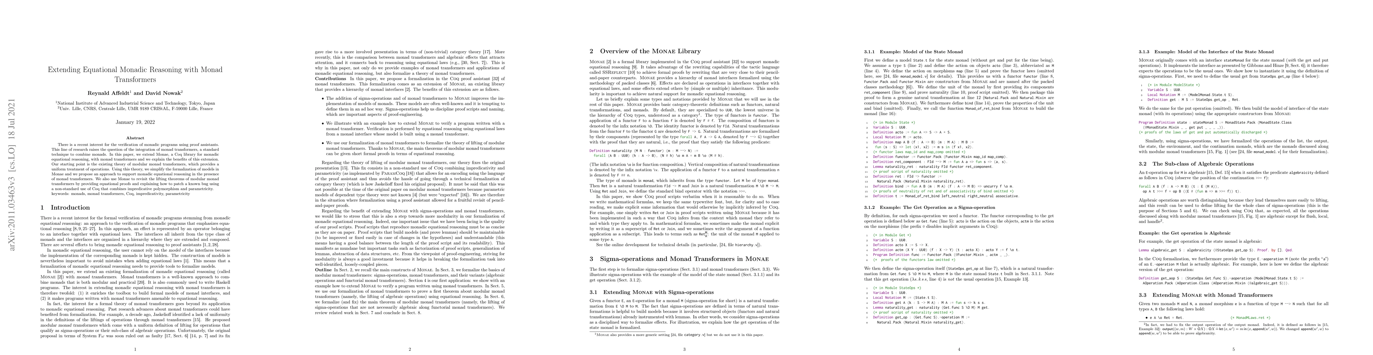 This paper extends Monae, a Coq library for monadic equational reasoning, to include monad transformers, thereby facilitating verification of monadic programs. It leverages modular monad transformer theory to simplify formalization and provides equational proofs for lifting theorems, also addressing a known bug using advanced Coq techniques.