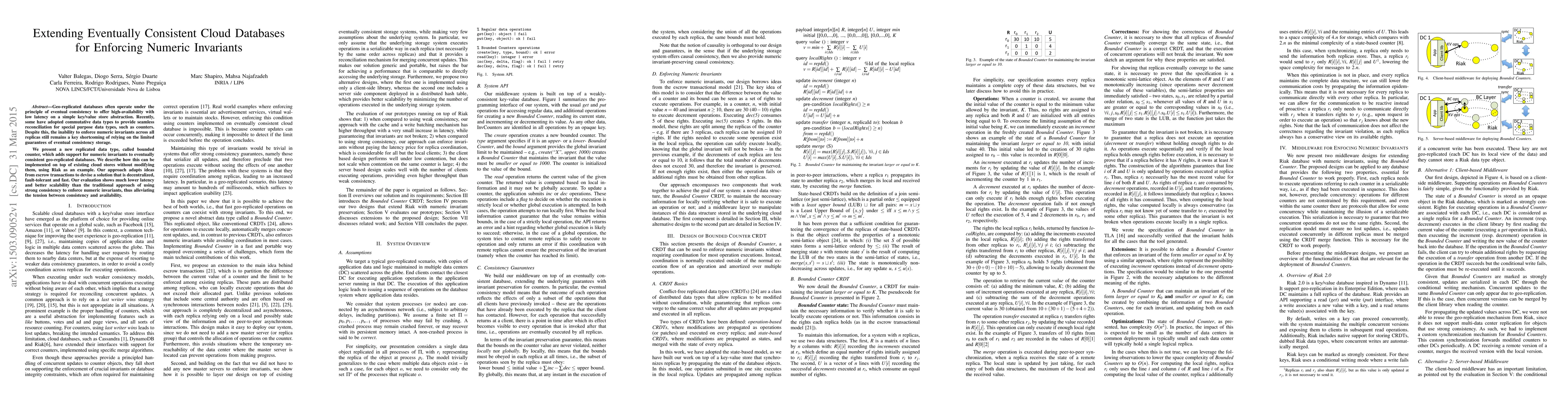 This paper introduces a new replicated data type called "bounded counter" to enforce numeric invariants in eventually consistent cloud databases. The approach leverages escrow transaction principles to implement decentralized, fault-tolerant, and fast numeric invariant enforcement without modifying existing cloud stores, demonstrating lower latency and better scalability compared to strong consistency methods.