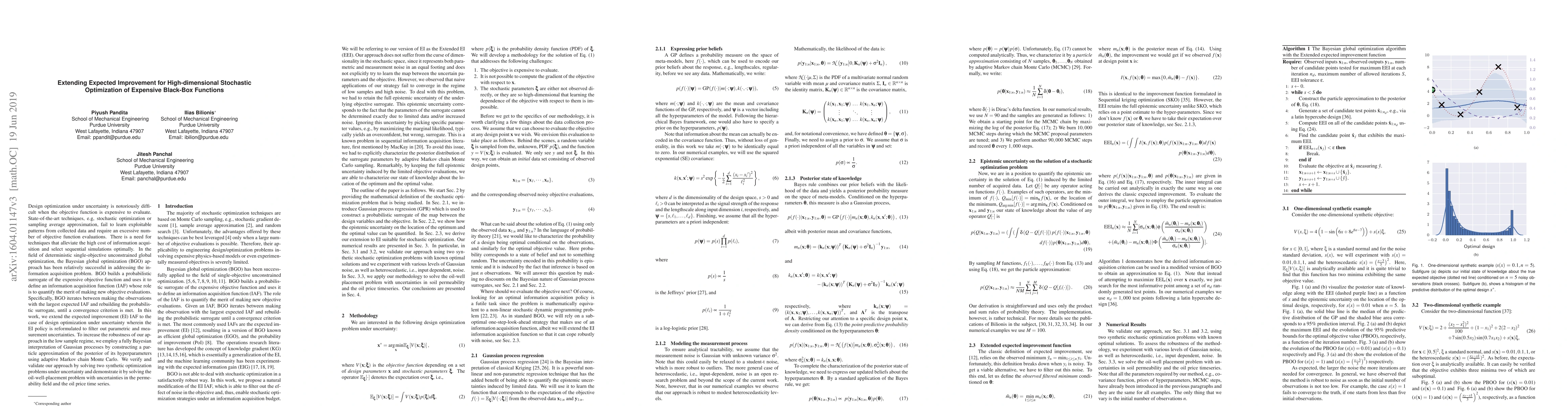 Design optimization under uncertainty is notoriously difficult when the objective function is expensive to evaluate. State-of-the-art techniques, e.g, stochastic optimization or sampling average approximation, fail to learn exploitable patterns from collected data and require an excessive number of objective function evaluations. There is a need for techniques that alleviate the high cost of information acquisition and select sequential simulations optimally. In the field of deterministic single-objective unconstrained global optimization, the Bayesian global optimization (BGO) approach has been relatively successful in addressing the information acquisition problem. BGO builds a probabilistic surrogate of the expensive objective function and uses it to define an information acquisition function (IAF) whose role is to quantify the merit of making new objective evaluations. Specifically, BGO iterates between making the observations with the largest expected IAF and rebuilding the probabilistic surrogate, until a convergence criterion is met. In this work, we extend the expected improvement (EI) IAF to the case of design optimization under uncertainty wherein the EI policy is reformulated to filter out parametric and measurement uncertainties. To increase the robustness of our approach in the low sample regime, we employ a fully Bayesian interpretation of Gaussian processes by constructing a particle approximation of the posterior of its hyperparameters using adaptive Markov chain Monte Carlo. We verify and validate our approach by solving two synthetic optimization problems under uncertainty and demonstrate it by solving the oil-well-placement problem with uncertainties in the permeability field and the oil price time series.