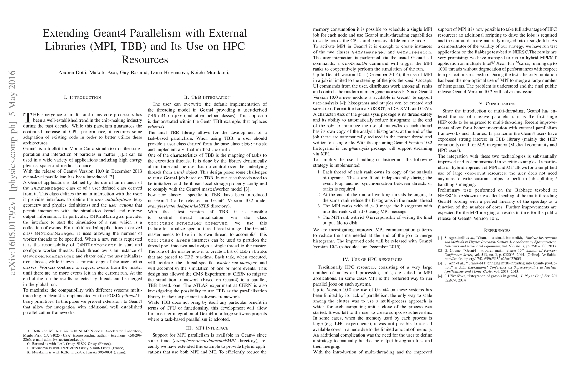 This paper discusses enhancements to Geant4, a popular Monte-Carlo code, for improved parallel processing on high-performance computing (HPC) resources. It introduces integration with external libraries like MPI and TBB for scaling across nodes and cores, enabling efficient use of multi- and many-core CPUs.