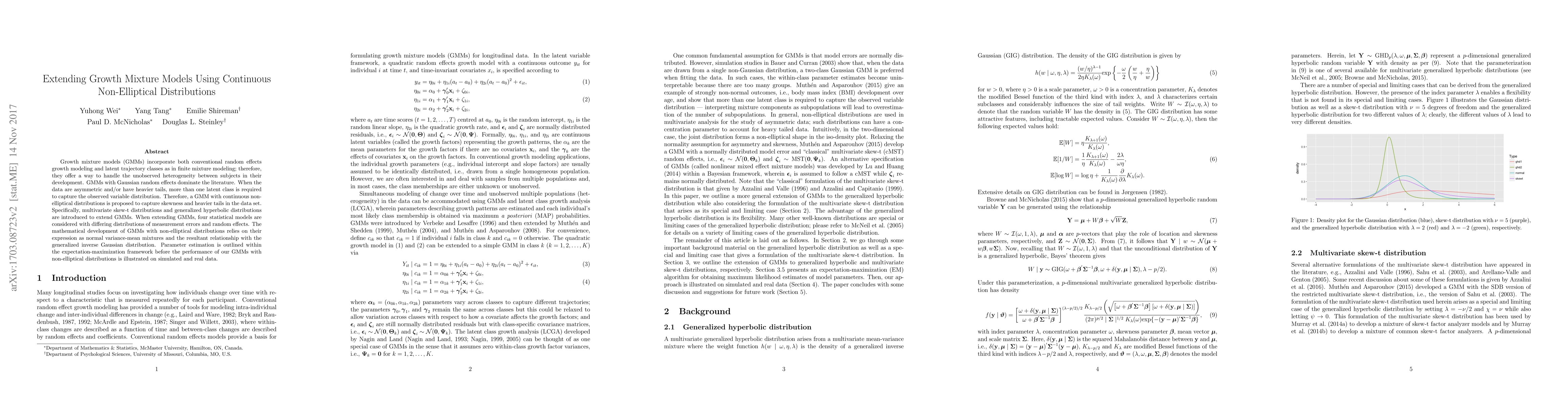 Growth mixture models (GMMs) incorporate both conventional random effects growth modeling and latent trajectory classes as in finite mixture modeling; therefore, they offer a way to handle the unobserved heterogeneity between subjects in their development. GMMs with Gaussian random effects dominate the literature. When the data are asymmetric and/or have heavier tails, more than one latent class is required to capture the observed variable distribution. Therefore, a GMM with continuous non-elliptical distributions is proposed to capture skewness and heavier tails in the data set. Specifically, multivariate skew-t distributions and generalized hyperbolic distributions are introduced to extend GMMs. When extending GMMs, four statistical models are considered with differing distributions of measurement errors and random effects. The mathematical development of GMMs with non-elliptical distributions relies on their expression as normal variance-mean mixtures and the resultant relationship with the generalized inverse Gaussian distribution. Parameter estimation is outlined within the expectation-maximization framework before the performance of our GMMs with non-elliptical distributions is illustrated on simulated and real data.