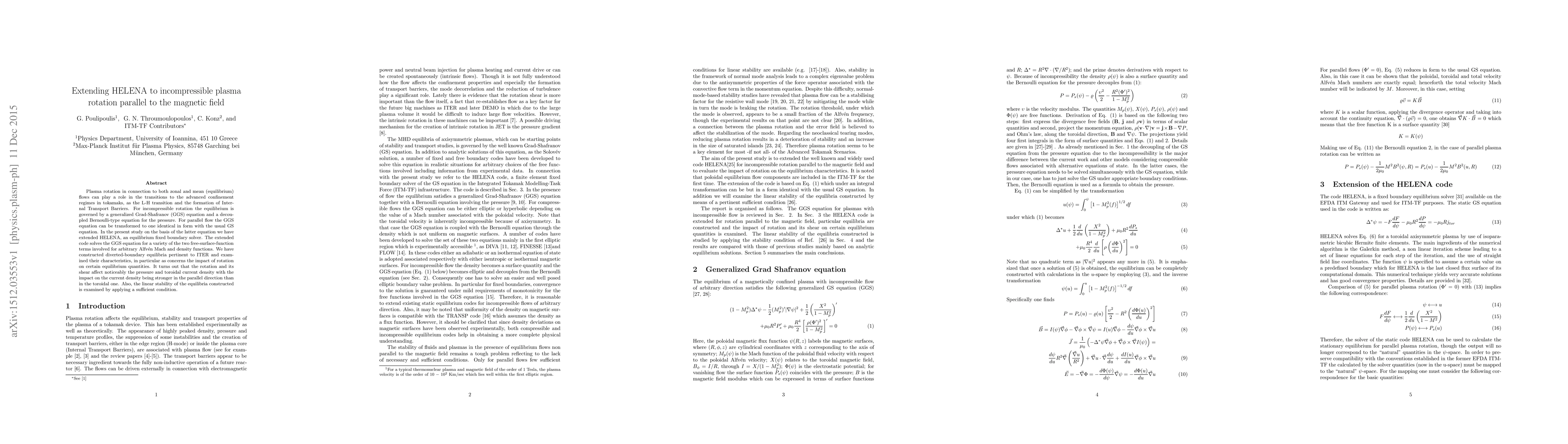 Plasma rotation in connection to both zonal and mean (equilibrium) flows can play a role in the transitions to the advanced confinement regimes in tokamaks, as the L-H transition and the formation of Internal Transport Barriers. For incompressible rotation the equilibrium is governed by a generalized Grad-Shafranov (GGS) equation and a decoupled Bernoulli-type equation for the pressure. For parallel flow the GGS equation can be transformed to one identical in form with the usual GS equation. In the present study on the basis of the latter equation we have extended HELENA, an equilibrium fixed boundary solver. The extended code solves the GGS equation for a variety of the two free-surface-function terms involved for arbitrary Alfv\'en Mach and density functions. We have constructed diverted-boundary equilibria pertinent to ITER and examined their characteristics, in particular as concerns the impact of rotation on certain equilibrium quantities. It turns out that the rotation and its shear affect noticeably the pressure and toroidal current density with the impact on the current density being stronger in the parallel direction than in the toroidal one. Also, the linear stability of the equilibria constructed is examined by applying a sufficient condition.