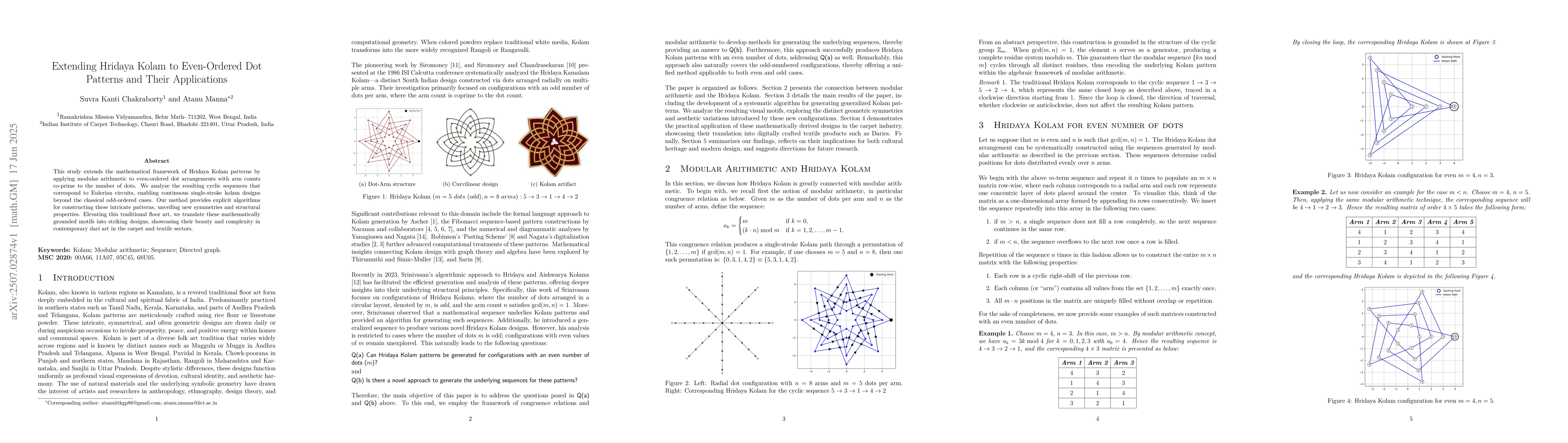 This study extends the mathematical framework of Hridaya Kolam patterns by applying modular arithmetic to even-ordered dot arrangements with arm counts co-prime to the number of dots. We analyze the resulting cyclic sequences that correspond to Eulerian circuits, enabling continuous single-stroke kolam designs beyond the classical odd-ordered cases. Our method provides explicit algorithms for constructing these intricate patterns, unveiling new symmetries and structural properties. Elevating this traditional floor art, we translate these mathematically grounded motifs into striking designs, showcasing their beauty and complexity in contemporary dari art in the carpet and textile sectors.