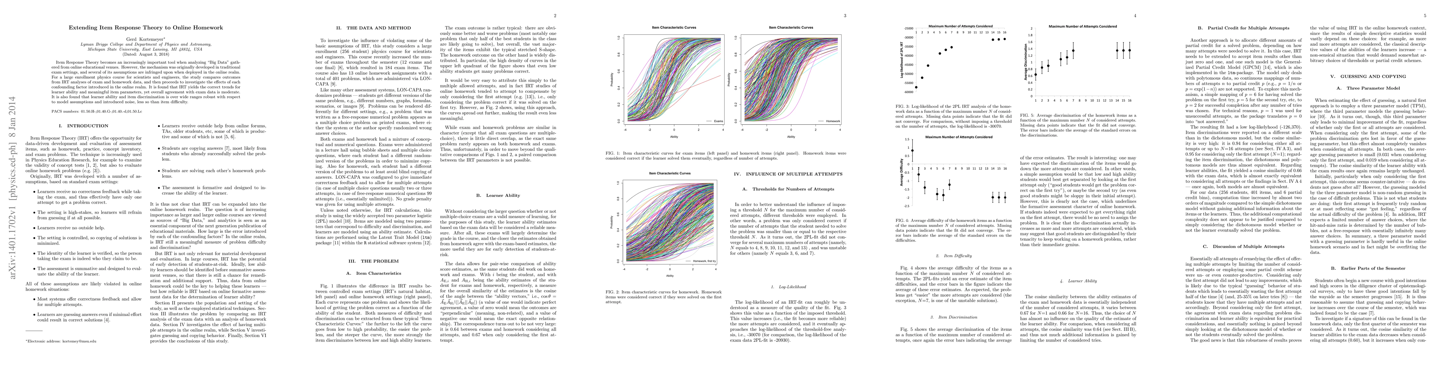 This study extends Item Response Theory to analyze "Big Data" from online homework in a large physics course, finding that while IRT identifies correct trends and item parameters, it shows moderate agreement with traditional exam data due to confounding factors in the online environment. The robustness of learner ability and item discrimination is noted, though item difficulty is less consistent.