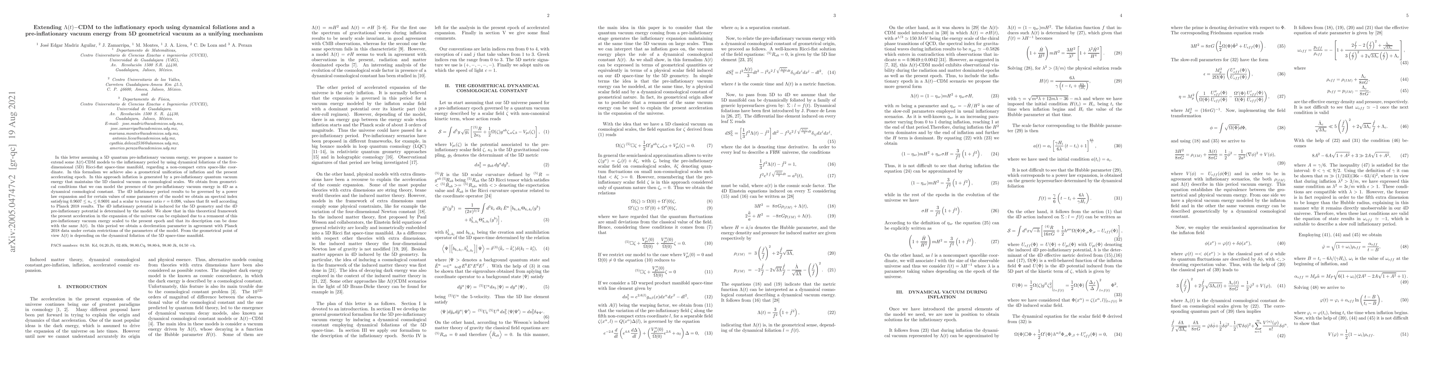 In this letter assuming a 5D quantum pre-inflationary vacuum energy, we propose a manner to extend some $\Lambda(t)$-CDM models to the inflationary period by using dynamical foliations of the five-dimensional (5D) Ricci-flat space-time manifold, regarding a non-compact extra space-like coor\-dinate. In this formalism we achieve also a geometrical unification of inflation and the present acce\-le\-rating epoch. In this approach inflation is generated by a pre-inflationary quantum vacuum energy that maintains the 5D classical vacuum on cosmological scales. We obtain from geometrical conditions that we can model the presence of the pre-inflationary vacuum energy in 4D as a dynamical cosmological constant. The 4D inflationary period results to be governed by a power law expansion and for certain values of some parameters of the model we obtain an spectral index satisfying $0.9607\leq n_s\leq 0.9691$ and a scalar to tensor ratio $r=0.098$, values that fit well according to Planck 2018 results. The 4D inflationary potential is induced for the 5D geometry and the 4D pre-inflationary potential is determined by the model. We show thatin this theoretical framework the present acceleration in the expansion of the universe can be explained due to a remanent of this pre-inflationary vacuum energy scaled to the present epoch and that its description can be done with the same $\Lambda(t)$. In this period we obtain a deceleration parameter in agreement with Planck 2018 data under certain restrictions of the parameters of the model. From the geometrical point of view $\Lambda(t)$ is depending on the dynamical foliation of the 5D space-time manifold.