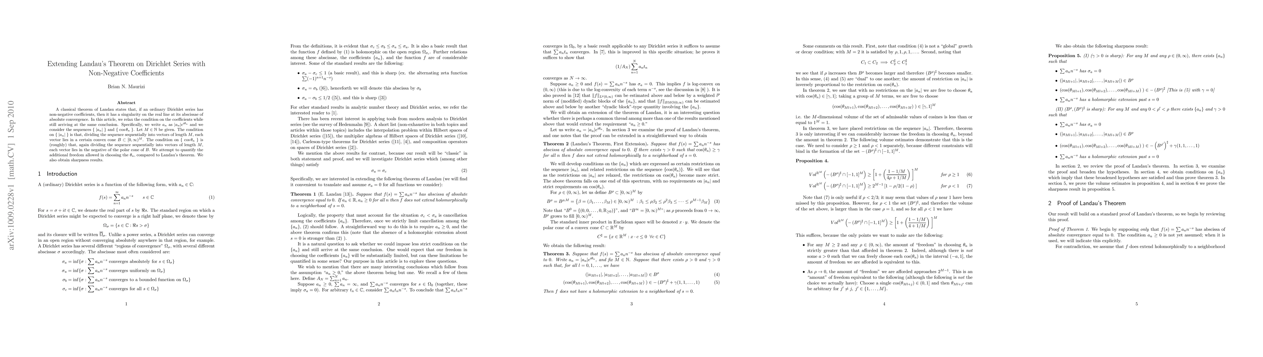 This research extends Landau's theorem on Dirichlet series with non-negative coefficients, relaxing the coefficient condition while maintaining the conclusion of a singularity on the real line. It introduces new criteria for coefficient sequences, quantifying extra freedom in choosing angles and proving sharpness results.