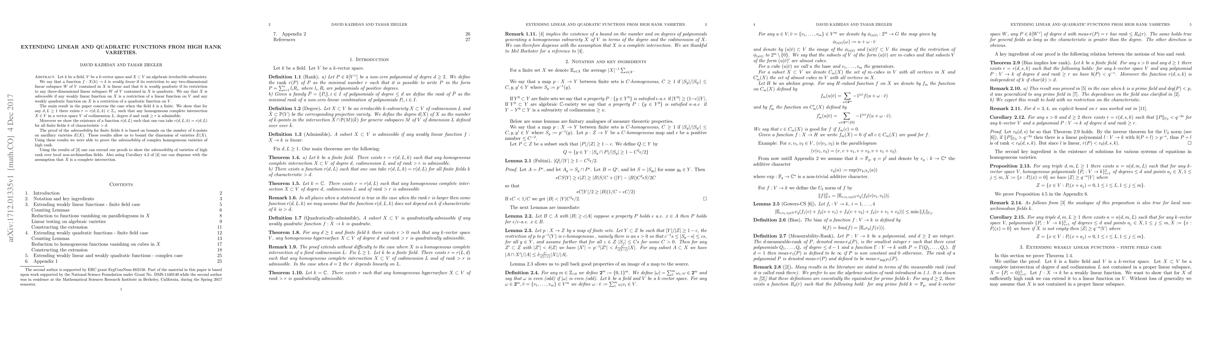 Let $k$ be a field, $V$ be a $k$-vector space and $X\subset V$ an algebraic irreducible subvariety. We say that a function $f:X(k) \to k$ is weakly linear if its restriction to any two-dimensional linear subspace $W$ of $V$ contained in $X$ is linear and that it is weakly quadratic if its restriction to any three-dimensional linear subspace $W$ of $V$ contained in $X$ is quadratic. We say that $X$ is admissible if any weakly linear function on $X$ is a restriction of a linear function on $V$ and any weakly quadratic function on $X$ is a restriction of a quadratic function on $V$. The main result in the paper concerns the case when the field $k$ is a finite. We show that for any $d,L\geq 1$ there exists $r=r(d,L,k)\in \mathbb Z _+$ such that any complete intersection $X\in V$ in a vector space $V$ of codimension $L$, degree $d$ and rank $\geq r$ is admissible. Moreover we show the existence of a function $r(d,L)$ such that one can take $r(d,L,k)=r(d,L)$ for all finite fields $k$ of characteristic $>d$. The proof of the admissibility for finite fields $k$ is based on bounds on the number of $k$-points on ancillary varieties $E(X)$. These results allow us to bound the dimension of varieties $E(X)$. Using these results we were able to prove the admissibility of complex homogeneous varieties of high rank. Using the results of \cite{br} one can extend our proofs to show the admissibility of varieties of high rank over local non-archimedian fields. Also using Corollary $4.3$ of \cite{cmpv} one can dispense with the assumption that $X$ is a complete intersection.