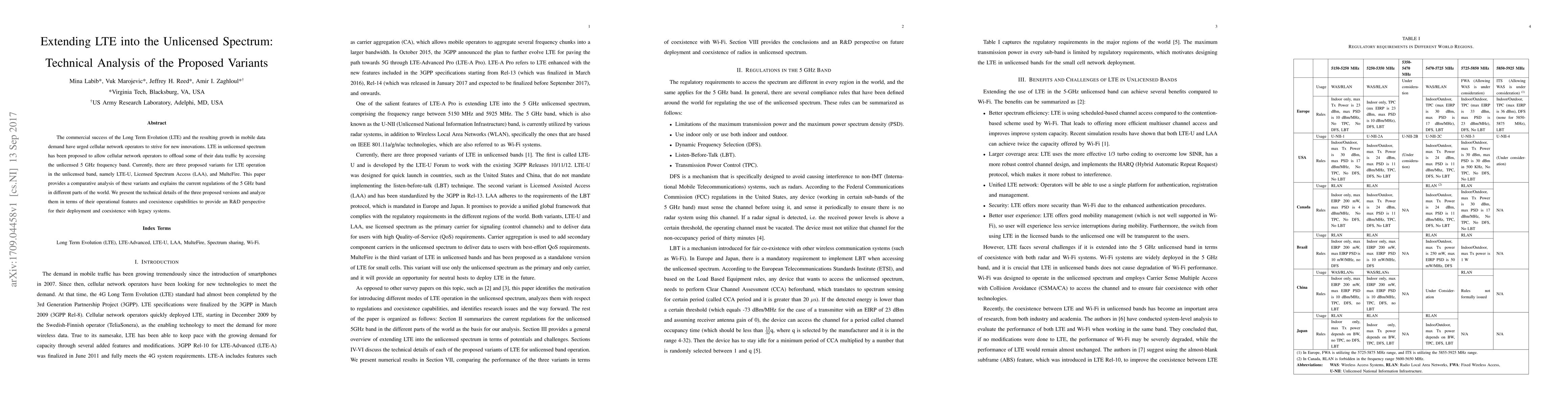This paper compares three proposed variants—LTE-U, LAA, and MulteFire—for extending LTE into the unlicensed 5 GHz spectrum to offload data traffic. It analyzes their technical details, operational features, and coexistence capabilities, providing insights for R&D and deployment alongside legacy systems.