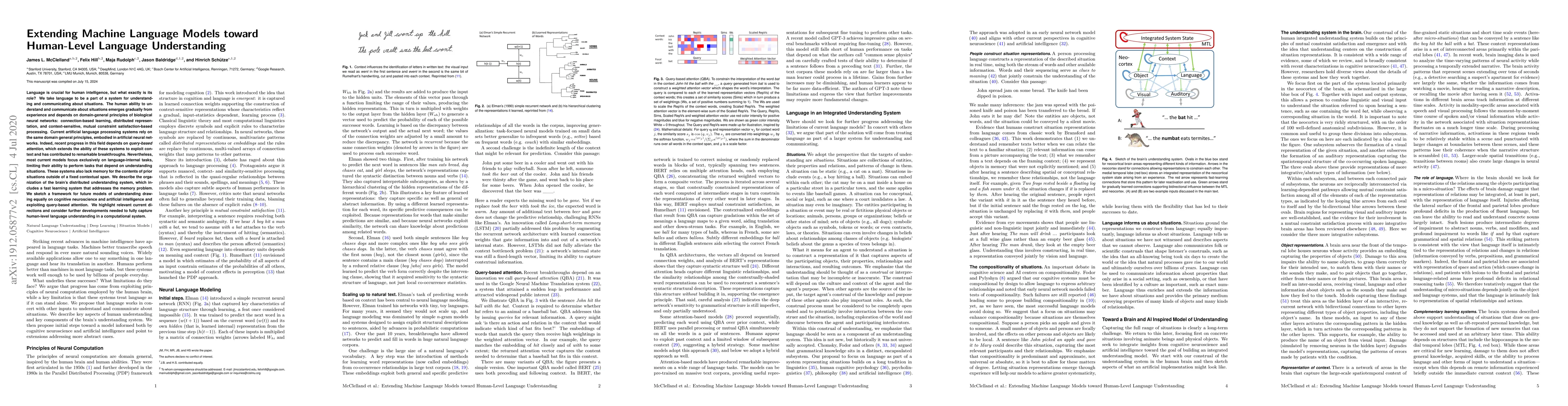 Language is crucial for human intelligence, but what exactly is its role? We take language to be a part of a system for understanding and communicating about situations. The human ability to understand and communicate about situations emerges gradually from experience and depends on domain-general principles of biological neural networks: connection-based learning, distributed representation, and context-sensitive, mutual constraint satisfaction-based processing. Current artificial language processing systems rely on the same domain general principles, embodied in artificial neural networks. Indeed, recent progress in this field depends on \emph{query-based attention}, which extends the ability of these systems to exploit context and has contributed to remarkable breakthroughs. Nevertheless, most current models focus exclusively on language-internal tasks, limiting their ability to perform tasks that depend on understanding situations. These systems also lack memory for the contents of prior situations outside of a fixed contextual span. We describe the organization of the brain's distributed understanding system, which includes a fast learning system that addresses the memory problem. We sketch a framework for future models of understanding drawing equally on cognitive neuroscience and artificial intelligence and exploiting query-based attention. We highlight relevant current directions and consider further developments needed to fully capture human-level language understanding in a computational system.