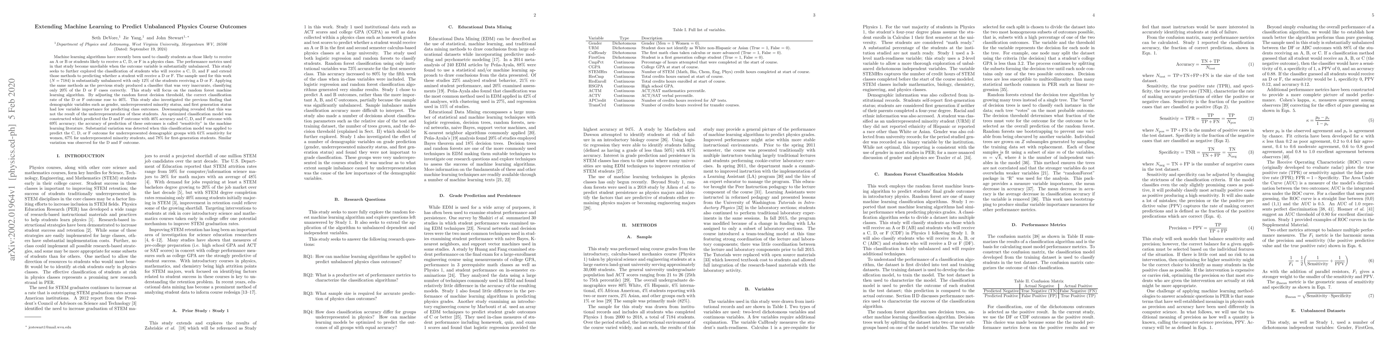 A study used machine learning to predict high school physics class outcomes, achieving 46% accuracy for predicting D or F grades, and varying sensitivity for underrepresented groups. The results improve upon previous methods, highlighting the importance of adjusting decision thresholds and considering demographic factors.