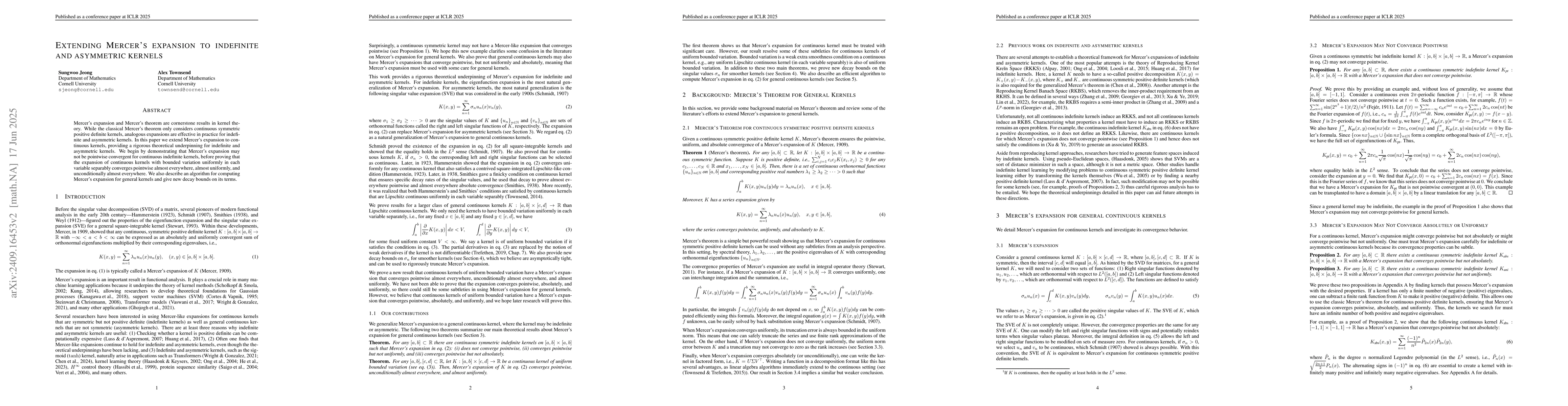 This paper extends Mercer's expansion to indefinite and asymmetric kernels, showing that while pointwise convergence may fail for continuous indefinite kernels, uniform convergence can be achieved under bounded variation conditions. An algorithm for computing the expansion and new decay bounds are also provided.