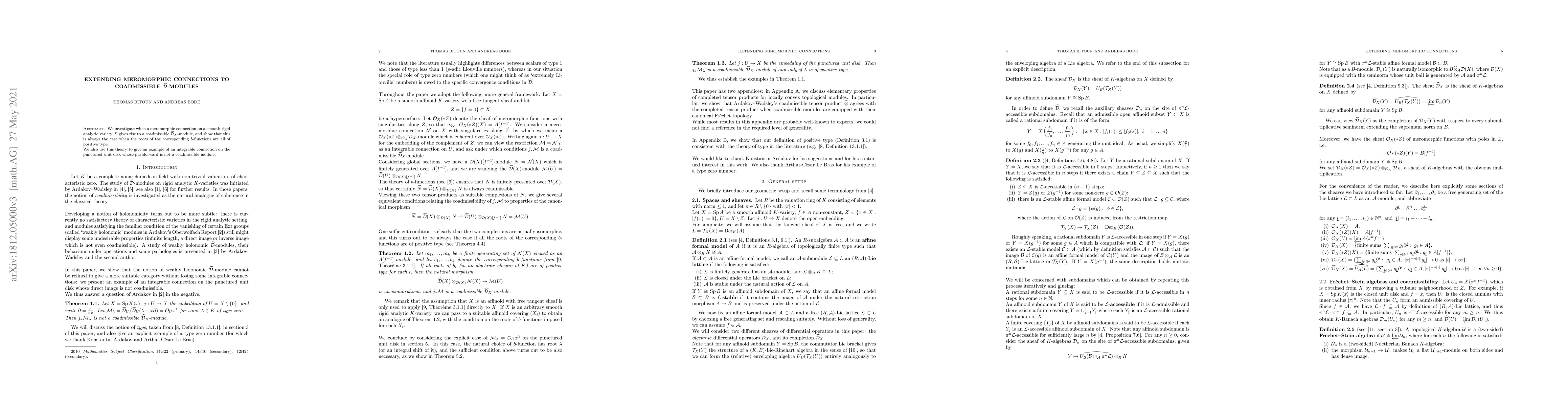 This paper explores the extension of meromorphic connections on smooth rigid analytic varieties to coadmissible $\mathcal{D}_X$-cap-modules, proving that such extensions always exist when the roots of the corresponding $b$-functions are positive. It also provides a counterexample of an integrable connection whose pushforward fails to be coadmissible.