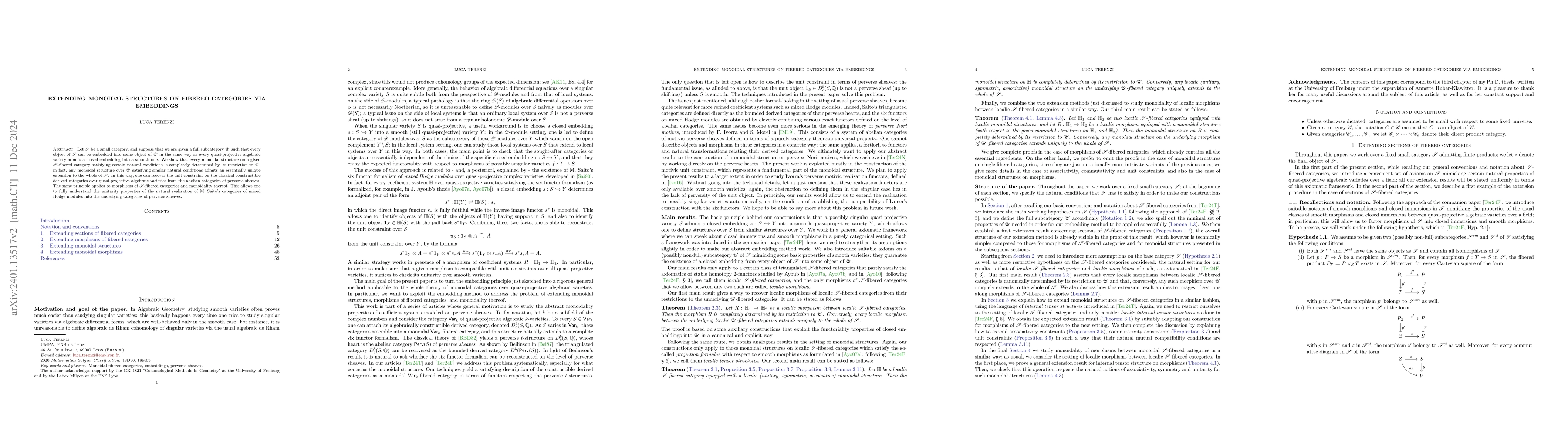 This paper demonstrates that monoidal structures on $\mathcal{S}$-fibered categories can be uniquely extended via embeddings from a full subcategory $\mathcal{U}$, mirroring the embedding of quasi-projective varieties into smooth ones. This principle facilitates the recovery of unit constraints in classical constructible derived categories from abelian categories of perverse sheaves.
