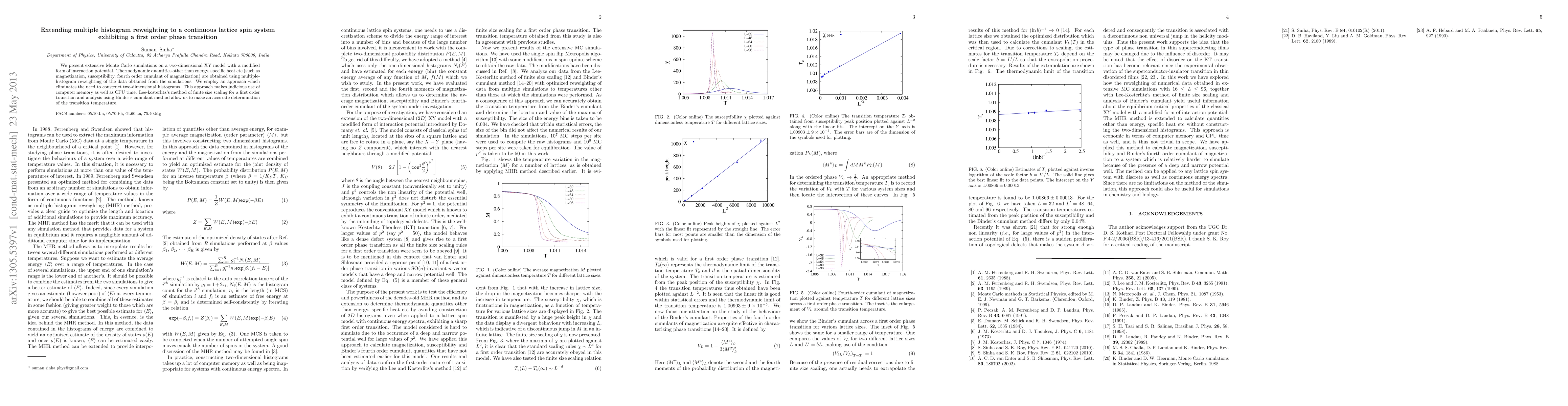 Researchers used Monte Carlo simulations to study a 2D XY model with a first-order phase transition, extracting thermodynamic quantities using multiple-histogram reweighting. They found accurate results for the transition temperature using Lee-kosterlitz's method of finite size scaling and Binder's cumulant method.
