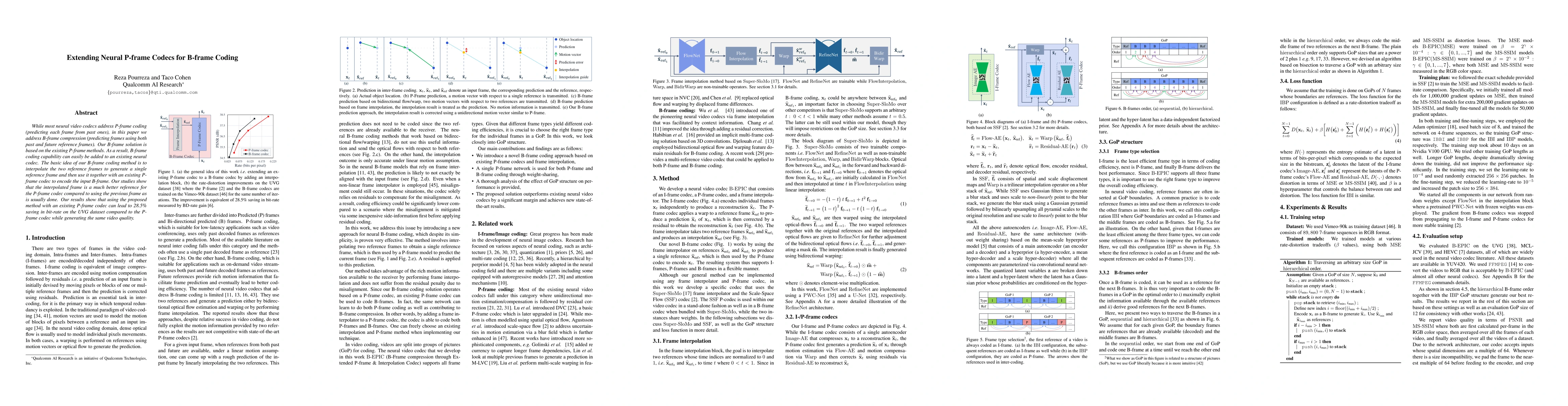 This paper proposes a method to extend neural P-frame codecs for B-frame coding by interpolating past and future reference frames to generate a single reference, which improves the efficiency of the P-frame codec. The results indicate a 28.5% bit-rate reduction on the UVG dataset while maintaining video quality.