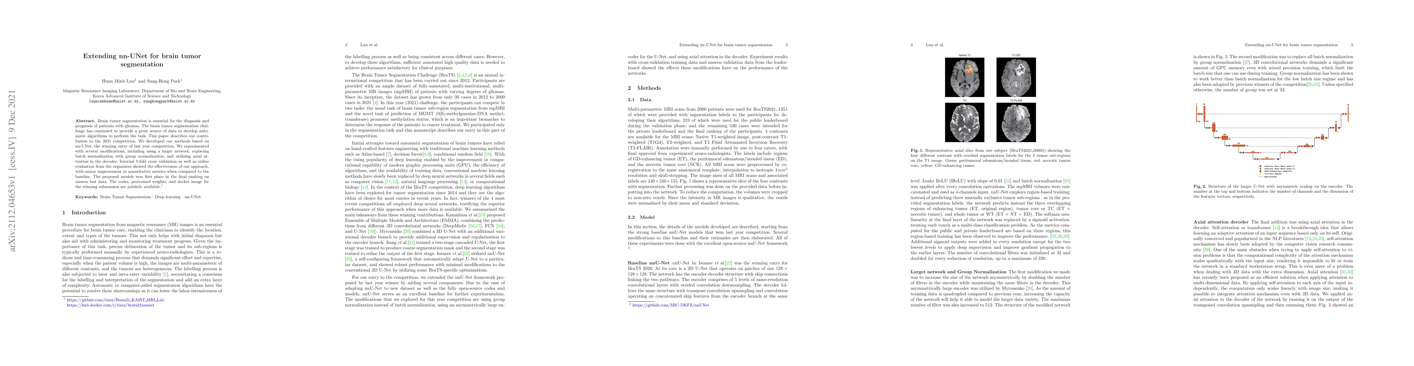 Brain tumor segmentation is essential for the diagnosis and prognosis of patients with gliomas. The brain tumor segmentation challenge has continued to provide a great source of data to develop automatic algorithms to perform the task. This paper describes our contribution to the 2021 competition. We developed our methods based on nn-UNet, the winning entry of last year competition. We experimented with several modifications, including using a larger network, replacing batch normalization with group normalization, and utilizing axial attention in the decoder. Internal 5-fold cross validation as well as online evaluation from the organizers showed the effectiveness of our approach, with minor improvement in quantitative metrics when compared to the baseline. The proposed models won first place in the final ranking on unseen test data. The codes, pretrained weights, and docker image for the winning submission are publicly available at https://github.com/rixez/Brats21_KAIST_MRI_Lab