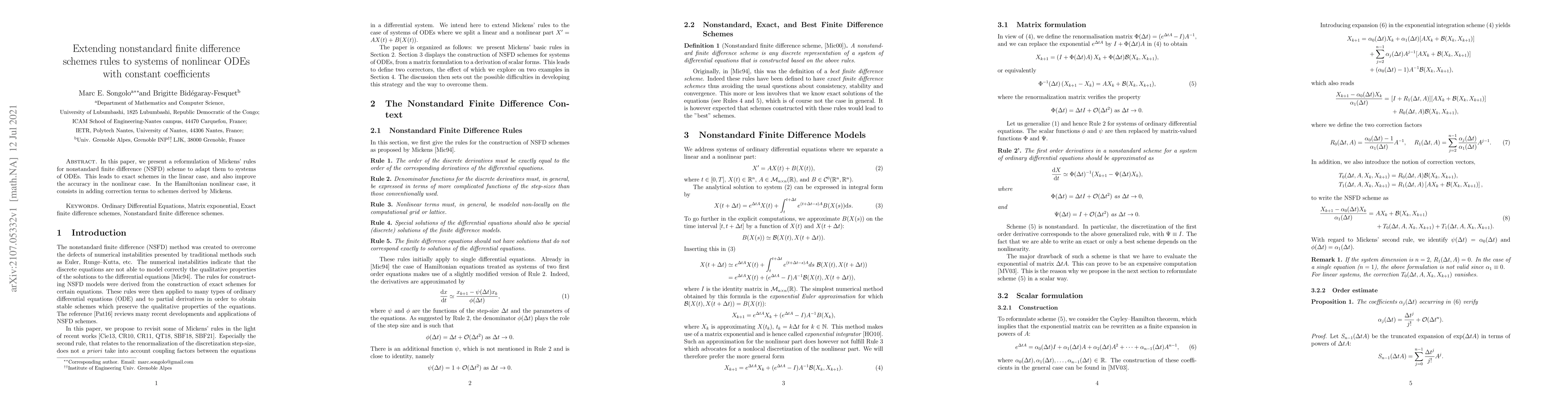 In this paper, we present a reformulation of Mickens' rules for nonstandard finite difference (NSFD) scheme to adapt them to systems of ODEs. This leads to exact schemes in the linear case, and also improve the accuracy in the nonlinear case. In the Hamiltonian nonlinear case, it consists in adding correction terms to schemes derived by Mickens.