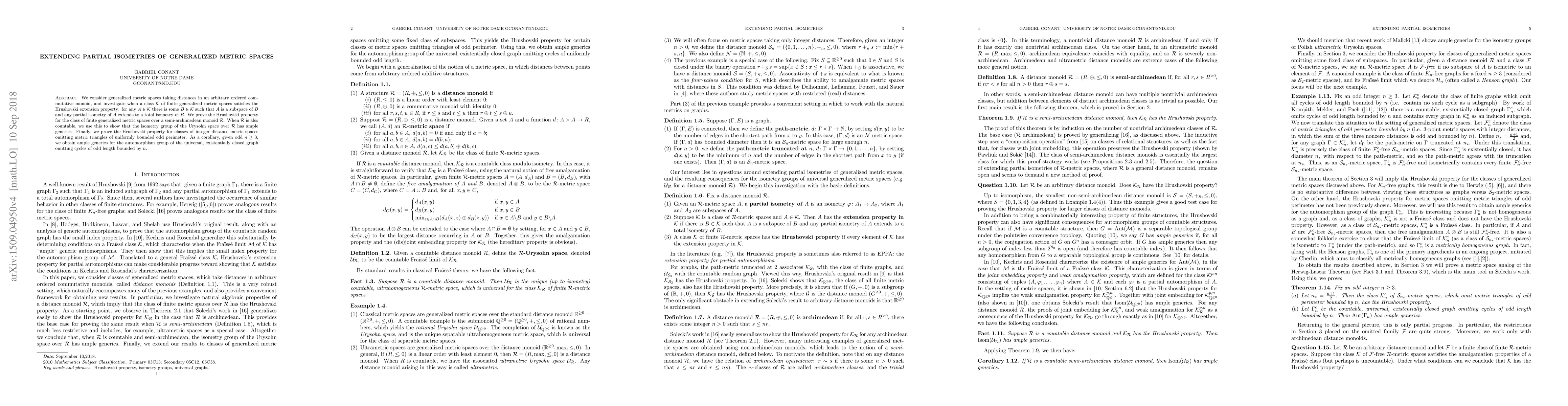 The paper investigates the Hrushovski extension property for finite generalized metric spaces over semi-archimedean monoids, showing it holds for certain classes of spaces, with implications for ample generics in isometry groups.