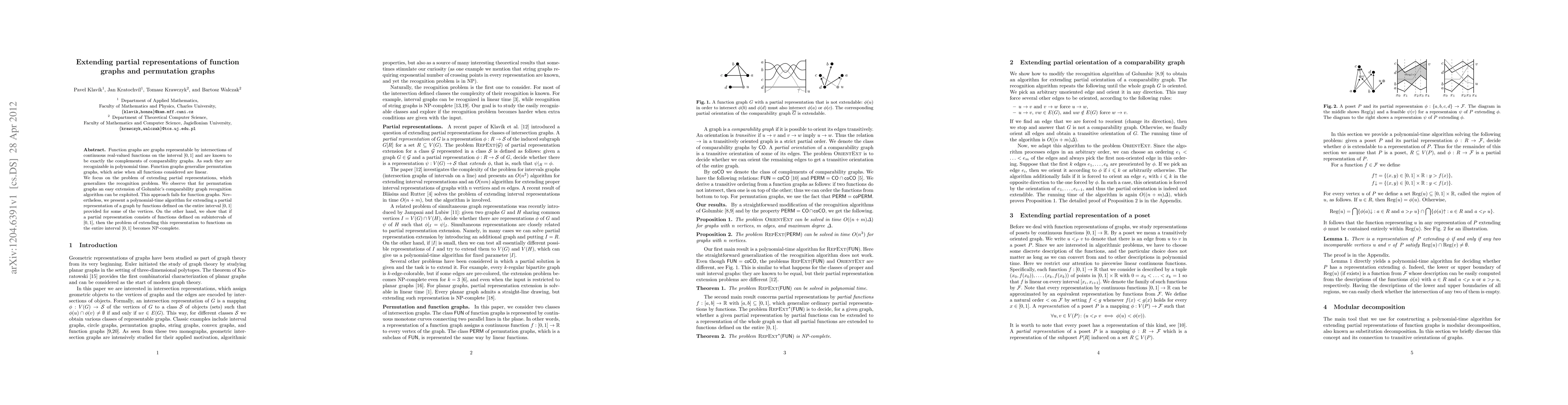 Function graphs are graphs representable by intersections of continuous real-valued functions on the interval [0,1] and are known to be exactly the complements of comparability graphs. As such they are recognizable in polynomial time. Function graphs generalize permutation graphs, which arise when all functions considered are linear. We focus on the problem of extending partial representations, which generalizes the recognition problem. We observe that for permutation graphs an easy extension of Golumbic's comparability graph recognition algorithm can be exploited. This approach fails for function graphs. Nevertheless, we present a polynomial-time algorithm for extending a partial representation of a graph by functions defined on the entire interval [0,1] provided for some of the vertices. On the other hand, we show that if a partial representation consists of functions defined on subintervals of [0,1], then the problem of extending this representation to functions on the entire interval [0,1] becomes NP-complete.