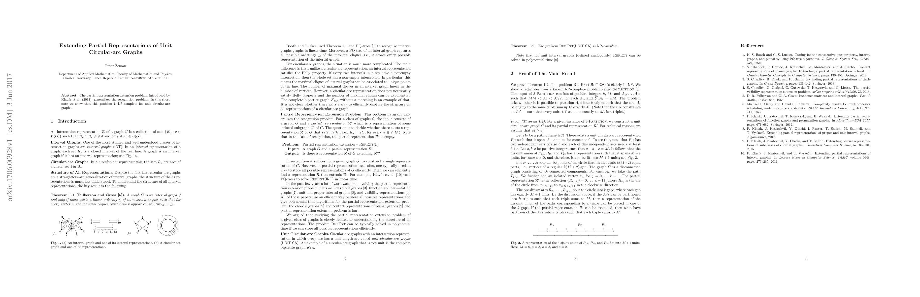 Summary: This paper proves that extending partial representations for unit circular-arc graphs is an NP-complete problem, generalizing the recognition problem introduced by Klavỳk et al. (2011).