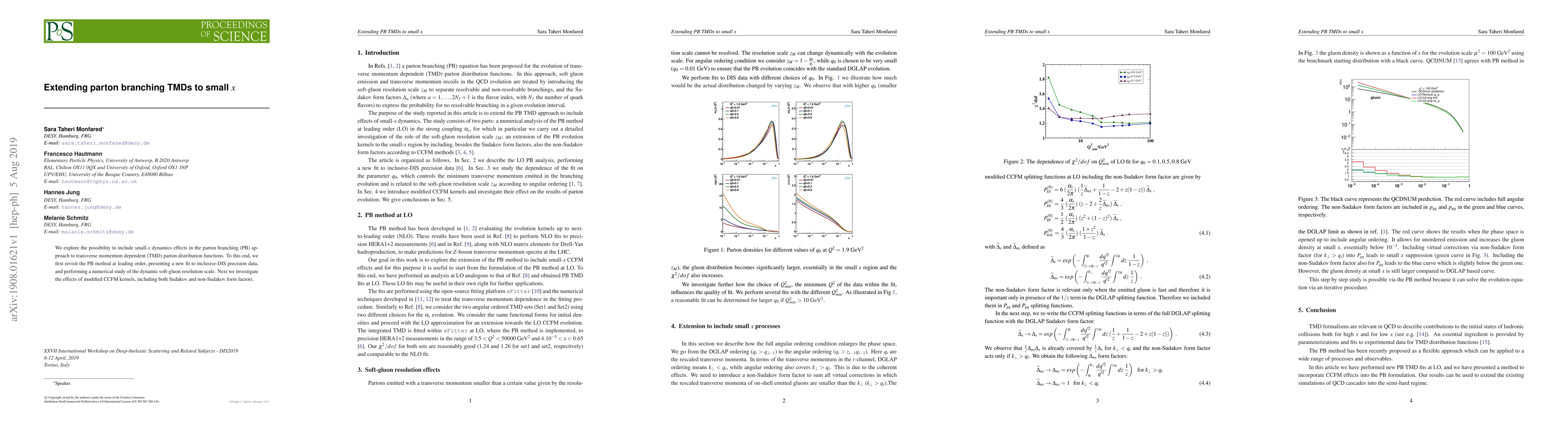 This paper extends the parton branching (PB) approach for transverse momentum dependent (TMD) parton distribution functions to include small-$x$ dynamics, presenting a new fit to inclusive-DIS data and exploring modified CCFM kernels with Sudakov and non-Sudakov form factors.
