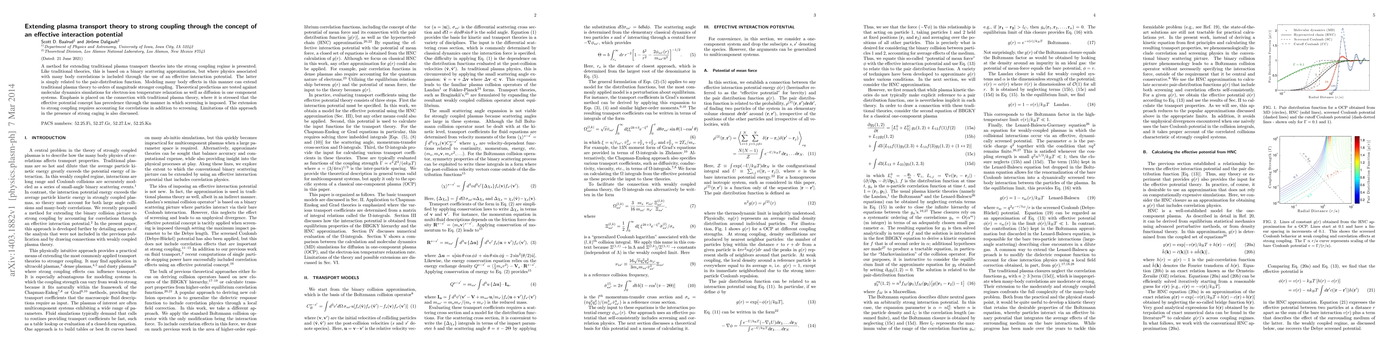 This paper proposes a method to extend traditional plasma transport theory into the strong coupling regime by incorporating many-body correlations via an effective interaction potential. The approach is validated against molecular dynamics simulations and emphasizes the connection to traditional plasma theory through the concept of screening.