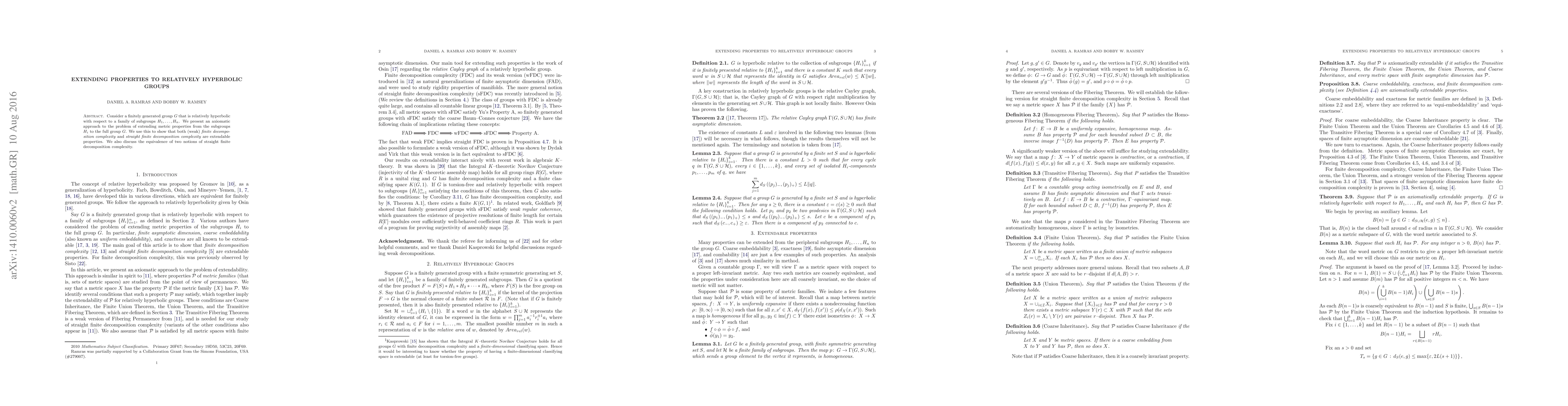 Consider a finitely generated group $G$ that is relatively hyperbolic with respect to a family of subgroups $H_1, ..., H_n$. We present an axiomatic approach to the problem of extending metric properties from the subgroups $H_i$ to the full group $G$. We use this to show that both (weak) finite decomposition complexity and straight finite decomposition complexity are extendable properties. We also discuss the equivalence of two notions of straight finite decomposition complexity.