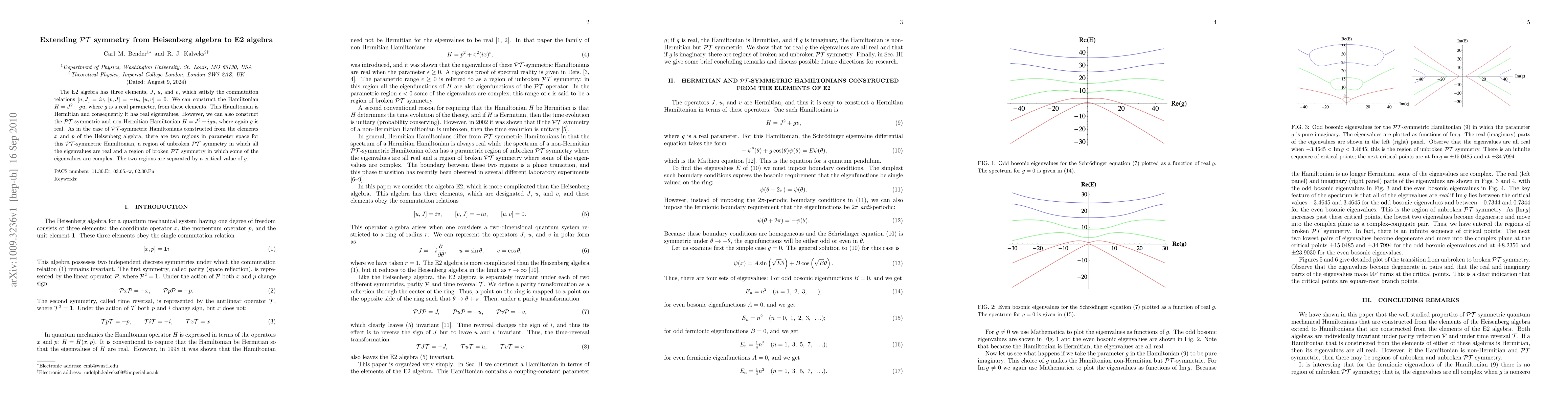The E2 algebra has three elements, J, u, and v, which satisfy the commutation relations [u,J]=iv, [v,J]=-iu, [u,v]=0. We can construct the Hamiltonian H=J^2+gu, where g is a real parameter, from these elements. This Hamiltonian is Hermitian and consequently it has real eigenvalues. However, we can also construct the PT-symmetric and non-Hermitian Hamiltonian H=J^2+igu, where again g is real. As in the case of PT-symmetric Hamiltonians constructed from the elements x and p of the Heisenberg algebra, there are two regions in parameter space for this PT-symmetric Hamiltonian, a region of unbroken PT symmetry in which all the eigenvalues are real and a region of broken PT symmetry in which some of the eigenvalues are complex. The two regions are separated by a critical value of g.