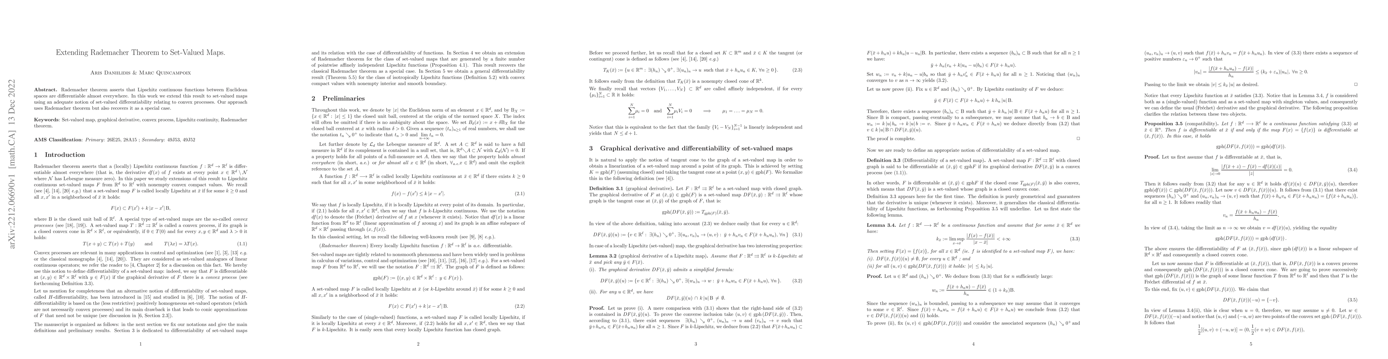 Summary: This paper extends the Rademacher theorem to set-valued maps by introducing a notion of set-valued differentiability linked to convex processes, thereby generalizing the theorem's applicability beyond single-valued functions. The approach retains the original theorem as a special case.