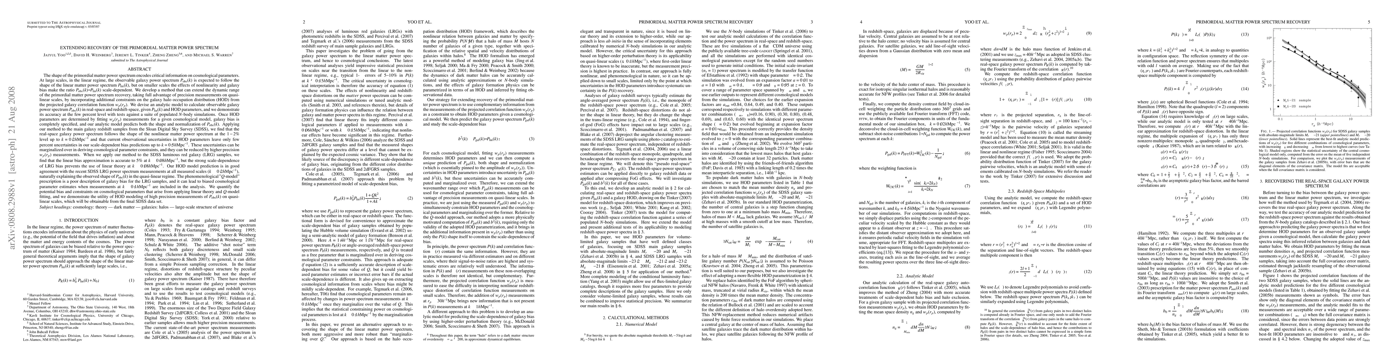 This paper develops a method to extend the recovery of the primordial matter power spectrum by incorporating galaxy halo occupation distribution (HOD) constraints from galaxy correlation functions. The method accurately predicts the galaxy power spectrum, showing that linear bias approximation is valid up to certain scales, and highlights the importance of HOD modeling for precise cosmological parameter estimates.
