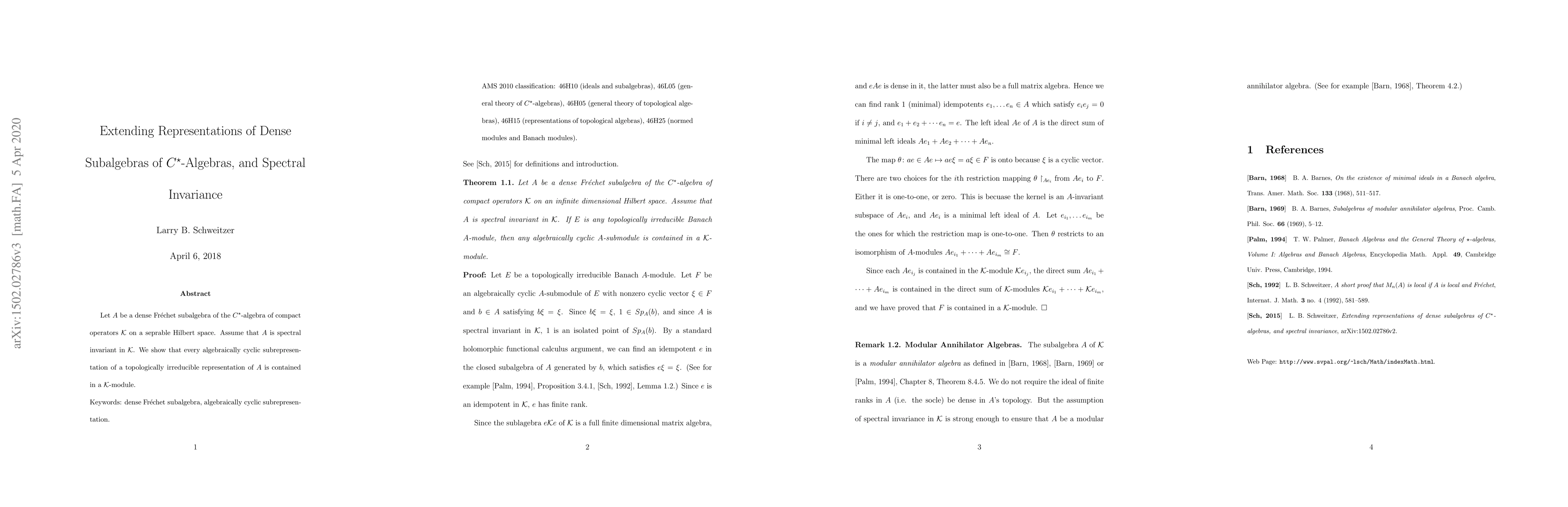 Let $A$ be a dense Fr\'echet subalgebra of the $C^\star$-algebra of compact operators $\cal K$ on a seprable Hilbert space. Assume that $A$ is spectral invariant in $\cal K$. We show that every algebraically cyclic subrepresentation of a topologically irreducible representation of $A$ is contained in a $\cal K$-module.