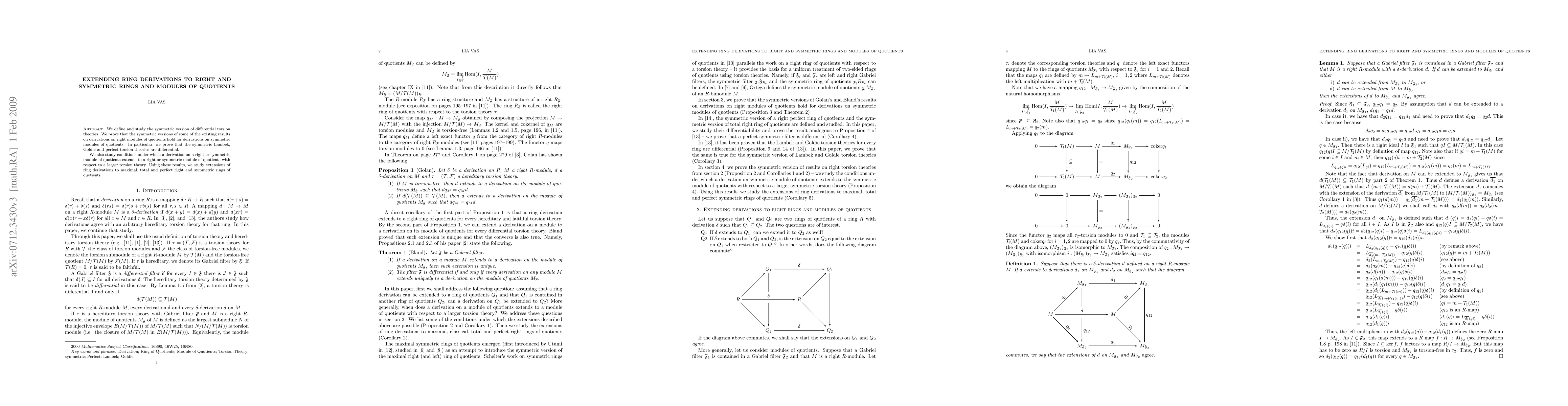 This paper defines and explores symmetric differential torsion theories, proving that certain existing derivation results on right modules of quotients extend to symmetric modules of quotients. It also investigates conditions for extending ring derivations to larger quotients and examines extensions to maximal, total, and perfect rings of quotients.