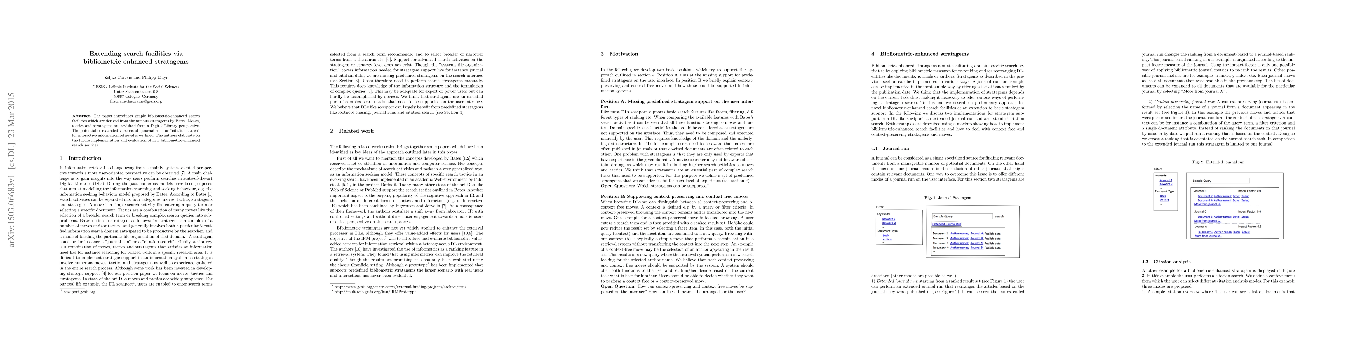 The paper introduces simple bibliometric-enhanced search facilities which are derived from the famous stratagems by Bates. Moves, tactics and stratagems are revisited from a Digital Library perspective. The potential of extended versions of "journal run" or "citation search" for interactive information retrieval is outlined. The authors elaborate on the future implementation and evaluation of new bibliometric-enhanced search services.