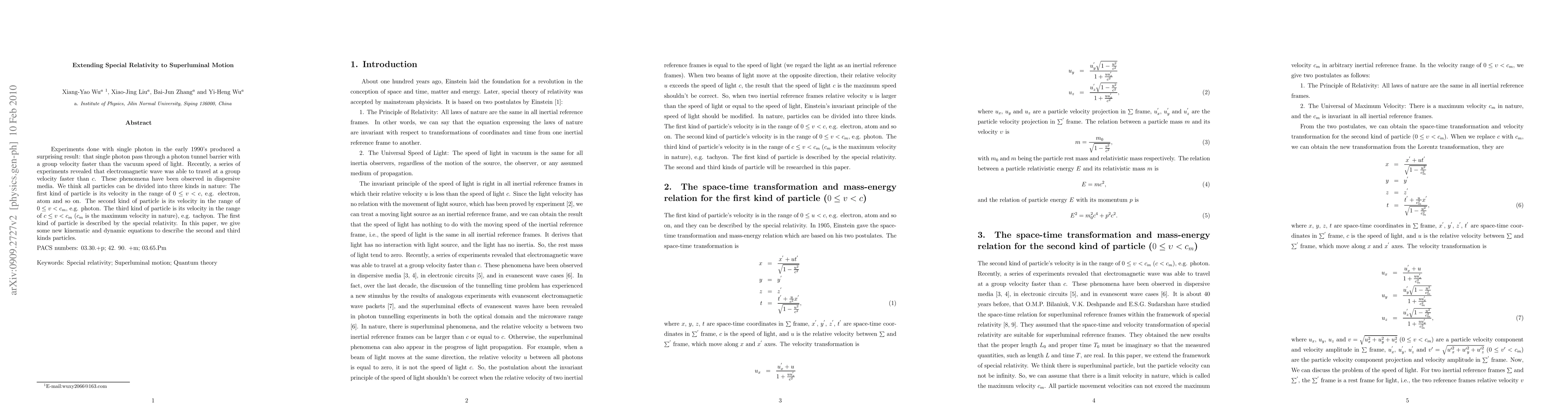 Experiments done with single photon in the early 1990's produced a surprising result: that single photon pass through a photon tunnel barrier with a group velocity faster than the vacuum speed of light. Recently, a series of experiments revealed that electromagnetic wave was able to travel at a group velocity faster than $c$. These phenomena have been observed in dispersive media. We think all particles can be divided into three kinds in nature: The first kind of particle is its velocity in the range of $0\leq v < c$, e.g. electron, atom and so on. The second kind of particle is its velocity in the range of $0\leq v < c_{m}$, e.g. photon. The third kind of particle is its velocity in the range of $c\leq v < c_{m}$ ($c_{m}$ is the maximum velocity in universe), e.g. tachyon. The first kind of particle is described by the special relativity. In this paper, we give some new kinematic and dynamic equations to describe the second and third kinds particles.