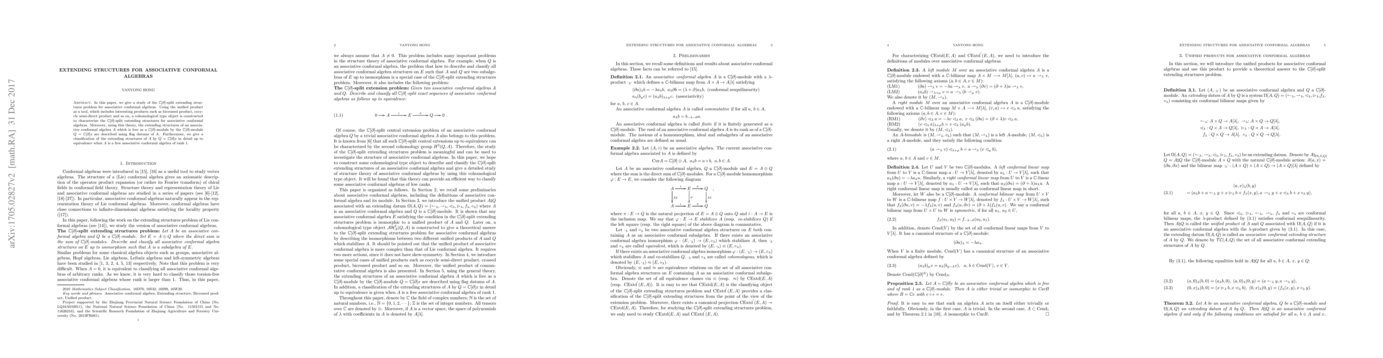 In this paper, we give a study of the $\mathbb{C}[\partial]$-split extending structures problem for associative conformal algebras. Using the unified product as a tool, which includes interesting products such as bicrossed product, cocycle semi-direct product and so on, a cohomological type object is constructed to characterize the $\mathbb{C}[\partial]$-split extending structures for associative conformal algebras. Moreover, using this theory, the extending structures of an associative conformal algebra $A$ which is free as a $\mathbb{C}[\partial]$-module by the $\mathbb{C}[\partial]$-module $Q=\mathbb{C}[\partial]x$ are described using flag datums of $A$. Furthermore, we give a classification of the extending structures of $A$ by $Q=\mathbb{C}[\partial]x$ in detail up to equivalence when $A$ is a free associative conformal algebra of rank 1.