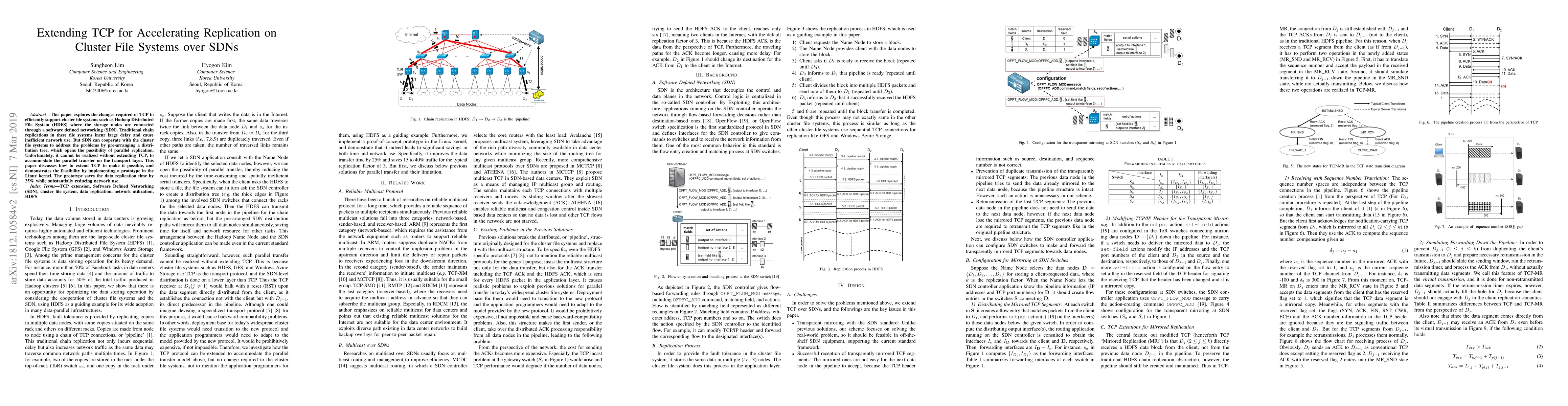 This paper proposes extending TCP to optimize replication in cluster file systems like HDFS over SDNs, enabling parallel replication and reducing network delays by 25%. A prototype implementation in the Linux kernel demonstrates the feasibility of this approach.