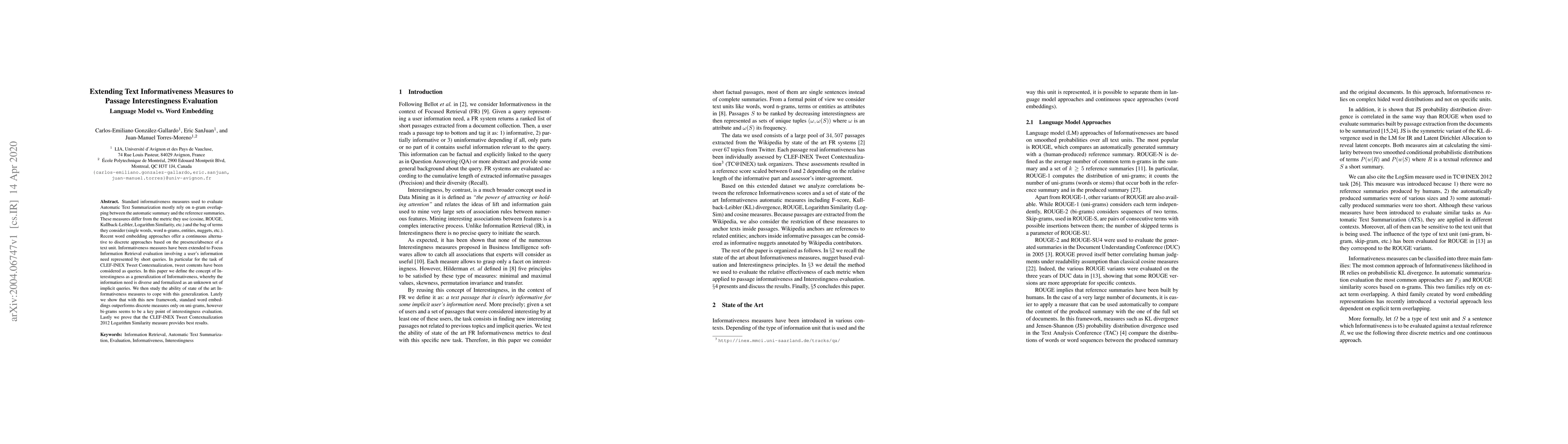 Standard informativeness measures used to evaluate Automatic Text Summarization mostly rely on n-gram overlapping between the automatic summary and the reference summaries. These measures differ from the metric they use (cosine, ROUGE, Kullback-Leibler, Logarithm Similarity, etc.) and the bag of terms they consider (single words, word n-grams, entities, nuggets, etc.). Recent word embedding approaches offer a continuous alternative to discrete approaches based on the presence/absence of a text unit. Informativeness measures have been extended to Focus Information Retrieval evaluation involving a user's information need represented by short queries. In particular for the task of CLEF-INEX Tweet Contextualization, tweet contents have been considered as queries. In this paper we define the concept of Interestingness as a generalization of Informativeness, whereby the information need is diverse and formalized as an unknown set of implicit queries. We then study the ability of state of the art Informativeness measures to cope with this generalization. Lately we show that with this new framework, standard word embeddings outperforms discrete measures only on uni-grams, however bi-grams seems to be a key point of interestingness evaluation. Lastly we prove that the CLEF-INEX Tweet Contextualization 2012 Logarithm Similarity measure provides best results.