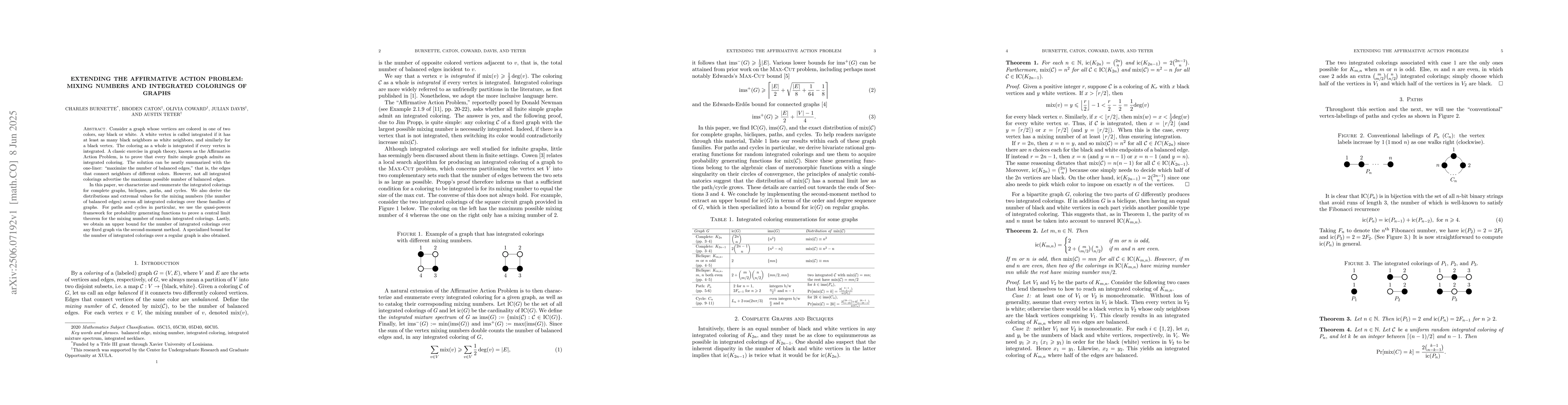 Consider a graph whose vertices are colored in one of two colors, say black or white. A white vertex is called integrated if it has at least as many black neighbors as white neighbors, and similarly for a black vertex. The coloring as a whole is integrated if every vertex is integrated. A classic exercise in graph theory, known as the Affirmative Action Problem, is to prove that every finite simple graph admits an integrated coloring. The solution can be neatly summarized with the one-liner: "maximize the number of balanced edges," that is, the edges that connect neighbors of different colors. However, not all integrated colorings advertise the maximum possible number of balanced edges. In this paper, we characterize and enumerate the integrated colorings for complete graphs, bicliques, paths, and cycles. We also derive the distributions and extremal values for the mixing numbers (the number of balanced edges) across all integrated colorings over these families of graphs. For paths and cycles in particular, we use the quasi-powers framework for probability generating functions to prove a central limit theorem for the mixing number of random integrated colorings. Lastly, we obtain an upper bound for the number of integrated colorings over any fixed graph via the second-moment method. A specialized bound for the number of integrated colorings over a regular graph is also obtained.