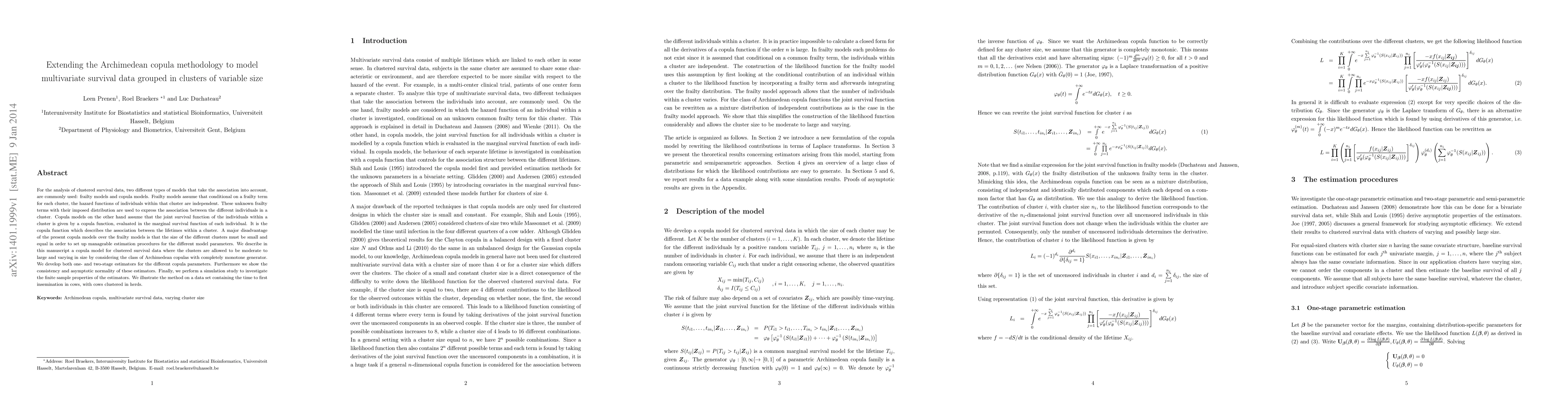 For the analysis of clustered survival data, two different types of models that take the association into account, are commonly used: frailty models and copula models. Frailty models assume that conditional on a frailty term for each cluster, the hazard functions of individuals within that cluster are independent. These unknown frailty terms with their imposed distribution are used to express the association between the different individuals in a cluster. Copula models on the other hand assume that the joint survival function of the individuals within a cluster is given by a copula function, evaluated in the marginal survival function of each individual. It is the copula function which describes the association between the lifetimes within a cluster. A major disadvantage of the present copula models over the frailty models is that the size of the different clusters must be small and equal in order to set up manageable estimation procedures for the different model parameters. We describe in this manuscript a copula model for clustered survival data where the clusters are allowed to be moderate to large and varying in size by considering the class of Archimedean copulas with completely monotone generator. We develop both one- and two-stage estimators for the different copula parameters. Furthermore we show the consistency and asymptotic normality of these estimators. Finally, we perform a simulation study to investigate the finite sample properties of the estimators. We illustrate the method on a data set containing the time to first insemination in cows, with cows clustered in herds.