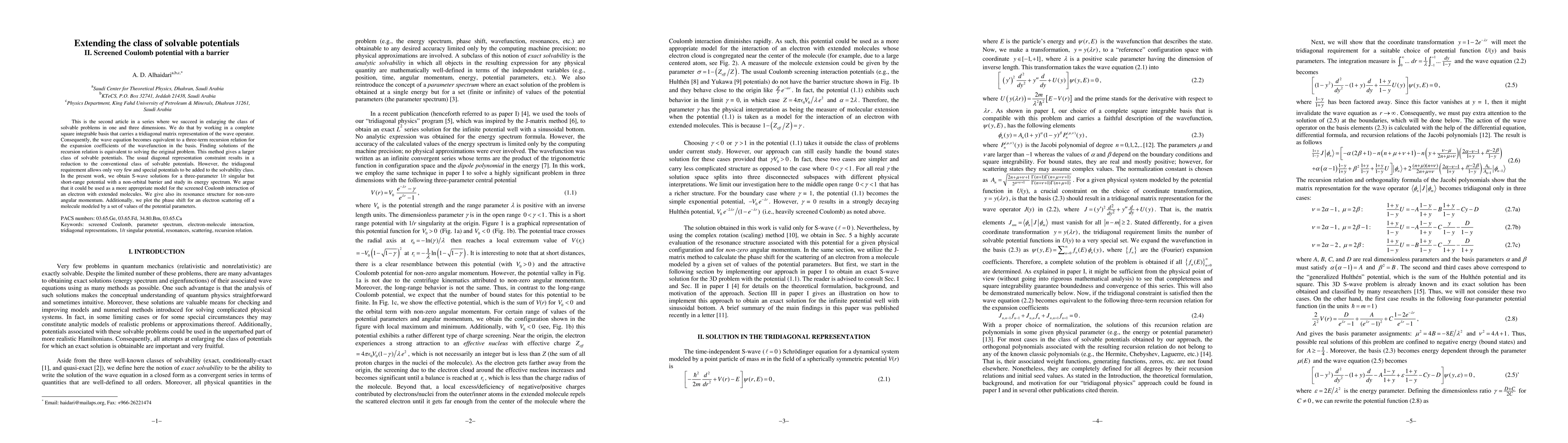 This is the second article in a series where we succeed in enlarging the class of solvable problems in one and three dimensions. We do that by working in a complete square integrable basis that carries a tridiagonal matrix representation of the wave operator. Consequently, the wave equation becomes equivalent to a three-term recursion relation for the expansion coefficients of the wavefunction in the basis. Finding solutions of the recursion relation is equivalent to solving the original problem. This method gives a larger class of solvable potentials. The usual diagonal representation constraint results in a reduction to the conventional class of solvable potentials. However, the tridiagonal requirement allows only very few and special potentials to be added to the solvability class. In the present work, we obtain S-wave solutions for a three-parameter 1/r singular but short-range potential with a non-orbital barrier and study its energy spectrum. We argue that it could be used as a more appropriate model for the screened Coulomb interaction of an electron with extended molecules. We give also its resonance structure for non-zero angular momentum. Additionally, we plot the phase shift for an electron scattering off a molecule modeled by a set of values of the potential parameters.