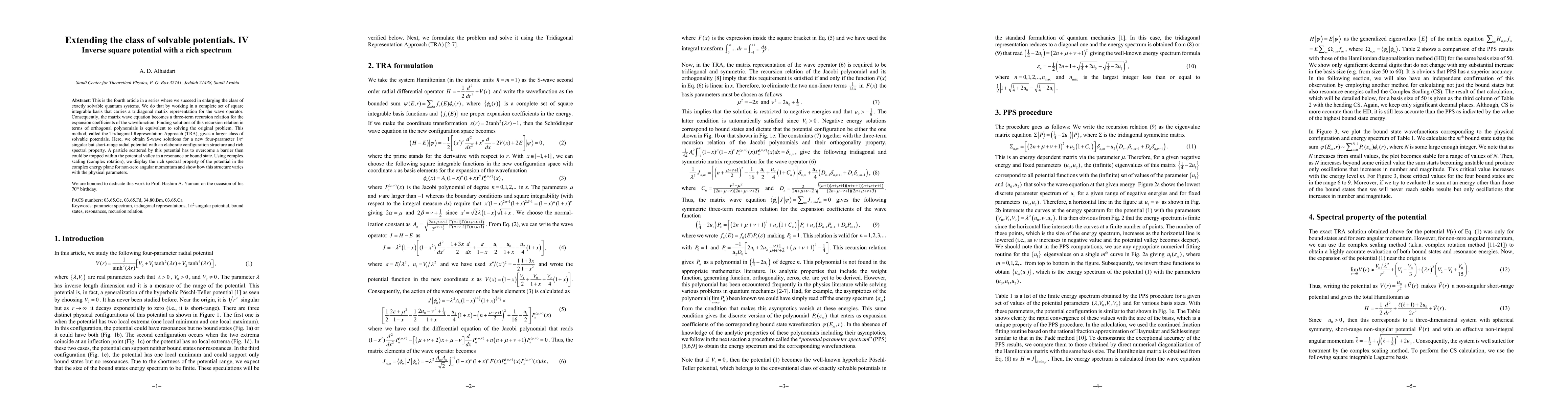 This is the fourth article in a series where we succeed in enlarging the class of exactly solvable quantum systems. We do that by working in a complete set of square integrable basis that carries a tridiagonal matrix representation for the wave operator. Consequently, the matrix wave equation becomes a three-term recursion relation for the expansion coefficients of the wavefunction. Finding solutions of this recursion relation in terms of orthogonal polynomials is equivalent to solving the original problem. This method, called the Tridiagonal Representation Approach (TRA), gives a larger class of solvable potentials. Here, we obtain S-wave solutions for a new four-parameter 1/r2 singular but short-range radial potential with an elaborate configuration structure and rich spectral property. A particle scattered by this potential has to overcome a barrier then could be trapped within the potential valley in a resonance or bound state. Using complex scaling (complex rotation), we display the rich spectral property of the potential in the complex energy plane for non-zero angular momentum and show how this structure varies with the physical parameters.