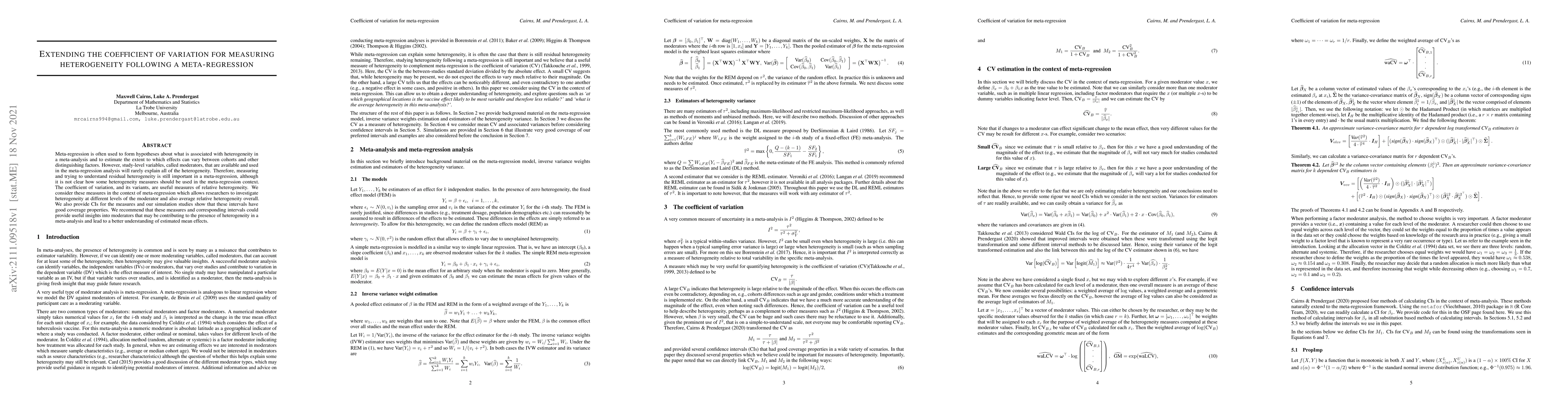 This paper extends the coefficient of variation to measure residual heterogeneity in meta-regression, offering confidence intervals for these measures. It demonstrates through simulation studies that these intervals effectively capture the heterogeneity, providing valuable insights into the factors contributing to variability in meta-analysis results.