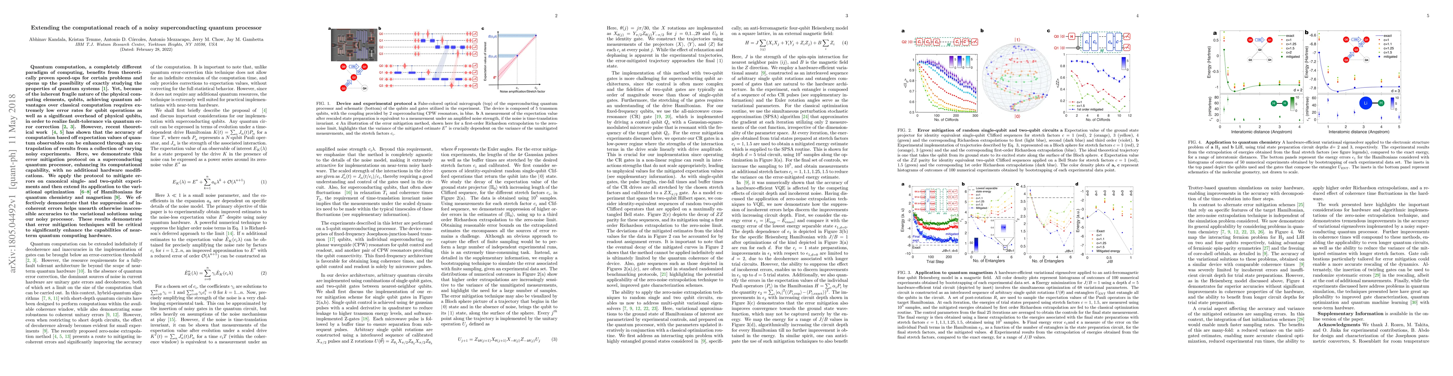 Quantum computation, a completely different paradigm of computing, benefits from theoretically proven speed-ups for certain problems and opens up the possibility of exactly studying the properties of quantum systems. Yet, because of the inherent fragile nature of the physical computing elements, qubits, achieving quantum advantages over classical computation requires extremely low error rates for qubit operations as well as a significant overhead of physical qubits, in order to realize fault-tolerance via quantum error correction. However, recent theoretical work has shown that the accuracy of computation based off expectation values of quantum observables can be enhanced through an extrapolation of results from a collection of varying noisy experiments. Here, we demonstrate this error mitigation protocol on a superconducting quantum processor, enhancing its computational capability, with no additional hardware modifications. We apply the protocol to mitigate errors on canonical single- and two-qubit experiments and then extend its application to the variational optimization of Hamiltonians for quantum chemistry and magnetism. We effectively demonstrate that the suppression of incoherent errors helps unearth otherwise inaccessible accuracies to the variational solutions using our noisy processor. These results demonstrate that error mitigation techniques will be critical to significantly enhance the capabilities of near-term quantum computing hardware.
