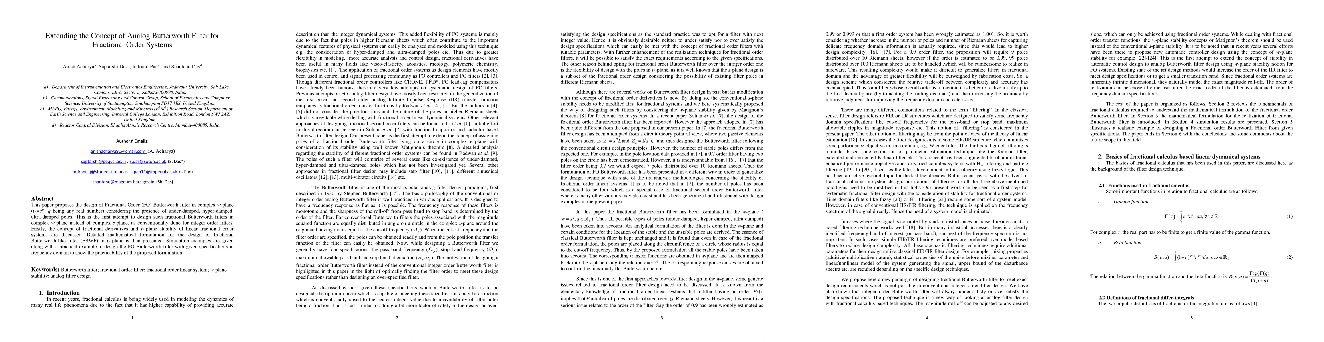 This paper proposes the design of Fractional Order (FO) Butterworth filter in complex w-plane (w=sq; q being any real number) considering the presence of under-damped, hyper-damped, ultra-damped poles. This is the first attempt to design such fractional Butterworth filters in complex w-plane instead of complex s-plane, as conventionally done for integer order filters. Firstly, the concept of fractional derivatives and w-plane stability of linear fractional order systems are discussed. Detailed mathematical formulation for the design of fractional Butterworth-like filter (FBWF) in w-plane is then presented. Simulation examples are given along with a practical example to design the FO Butterworth filter with given specifications in frequency domain to show the practicability of the proposed formulation.