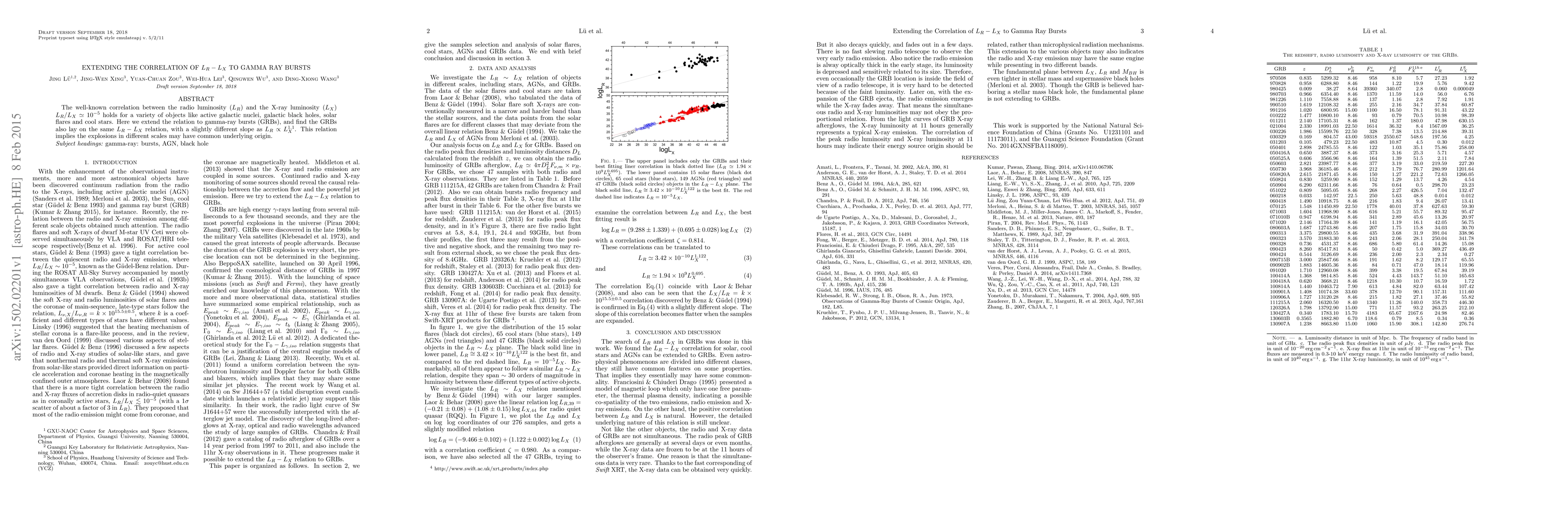 The well-known correlation between the radio luminosity ($L_R$) and the X-ray luminosity ($L_X$) $L_R / L_X \simeq 10^{-5}$ holds for a variety of objects like active galactic nuclei, galactic black holes, solar flares and cool stars. Here we extend the relation to gamma-ray bursts (GRBs), and find the GRBs also lay on the same $L_R-L_X$ relation, with a slightly different slope as $L_R \propto L_X^{1.1}$. This relation implies the explosions in different scales may have a common underlying origin.