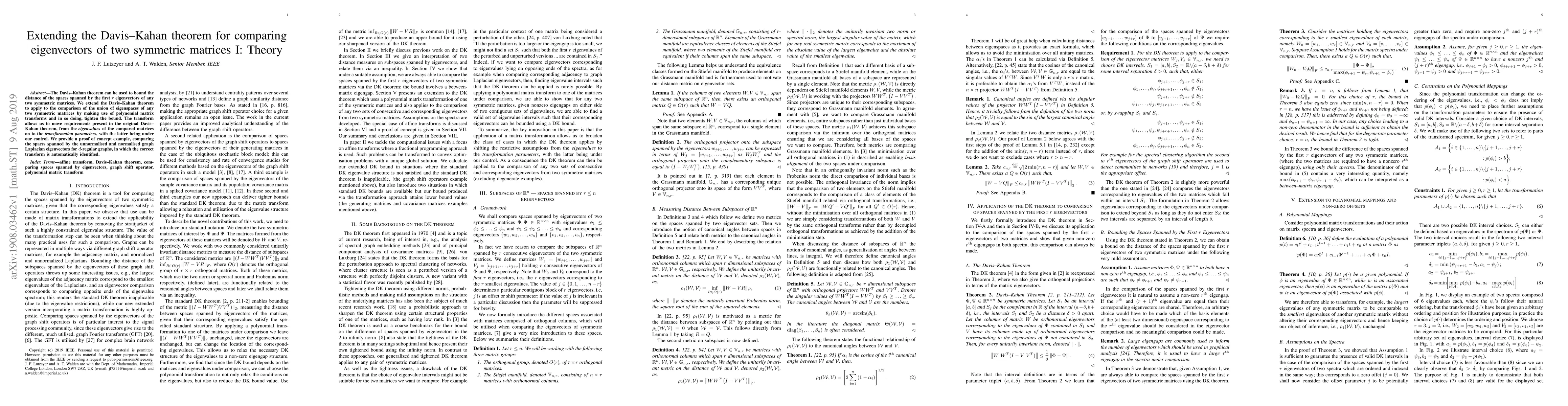 The Davis-Kahan theorem can be used to bound the distance of the spaces spanned by the first $r$ eigenvectors of any two symmetric matrices. We extend the Davis-Kahan theorem to apply to the comparison of the union of eigenspaces of any two symmetric matrices by making use of polynomial matrix transforms and in so doing, tighten the bound. The transform allows us to move requirements present in the original Davis-Kahan theorem, from the eigenvalues of the compared matrices on to the transformation parameters, with the latter being under our control. We provide a proof of concept example, comparing the spaces spanned by the unnormalised and normalised graph Laplacian eigenvectors for $d$-regular graphs, in which the correct transform is automatically identified.