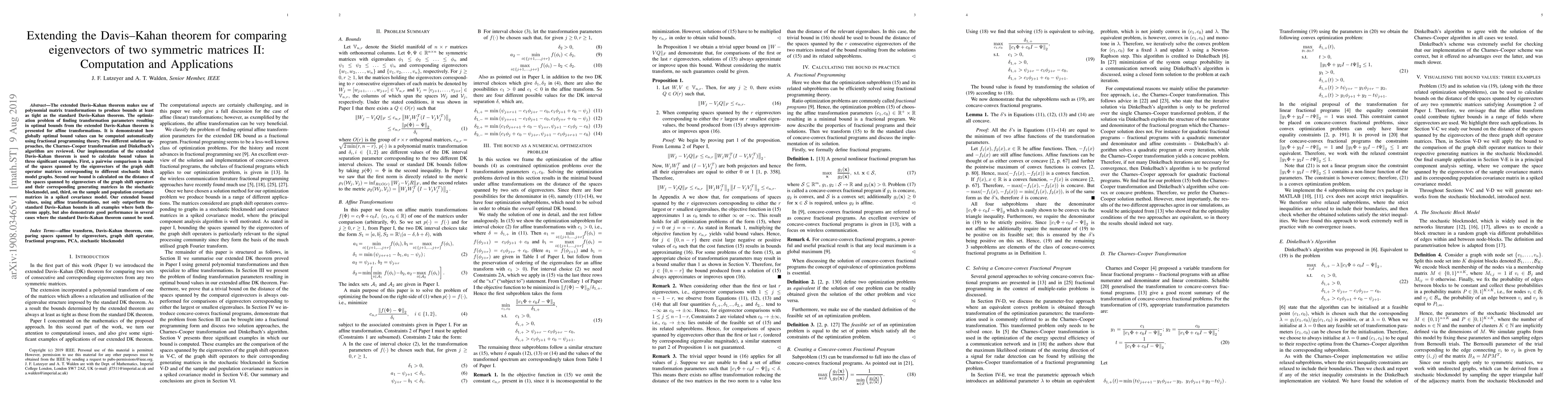 The extended Davis-Kahan theorem makes use of polynomial matrix transformations to produce bounds at least as tight as the standard Davis-Kahan theorem. The optimization problem of finding transformation parameters resulting in optimal bounds from the extended Davis-Kahan theorem is presented for affine transformations. It is demonstrated how globally optimal bound values can be computed automatically using fractional programming theory. Two different solution approaches, the Charnes-Cooper transformation and Dinkelbach's algorithm are reviewed. Our implementation of the extended Davis--Kahan theorem is used to calculate bound values in three significant examples. First, a pairwise comparison is made of the spaces spanned by the eigenvectors of the graph shift operator matrices corresponding to different stochastic block model graphs. Second our bound is calculated on the distance of the spaces spanned by eigenvectors of the graph shift operators and their corresponding generating matrices in the stochastic blockmodel, and, third, on the sample and population covariance matrices in a spiked covariance model. Our extended bound values, using affine transformations, not only outperform the standard Davis-Kahan bounds in all examples where both theorems apply, but also demonstrate good performance in several cases where the standard Davis-Kahan theorem cannot be used.