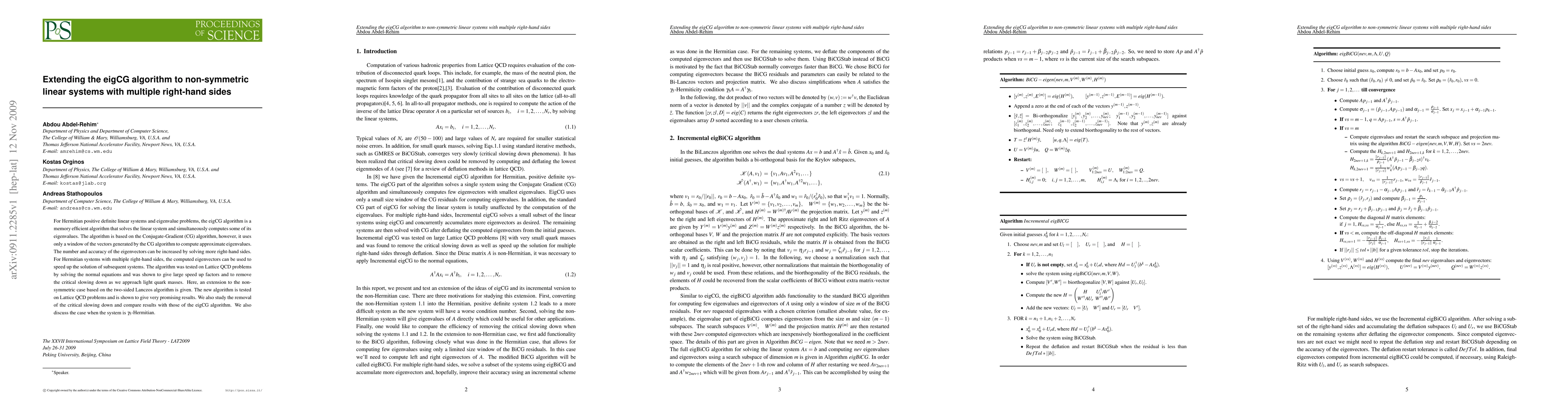 For Hermitian positive definite linear systems and eigenvalue problems, the eigCG algorithm is a memory efficient algorithm that solves the linear system and simultaneously computes some of its eigenvalues. The algorithm is based on the Conjugate-Gradient (CG) algorithm, however, it uses only a window of the vectors generated by the CG algorithm to compute approximate eigenvalues. The number and accuracy of the eigenvectors can be increased by solving more right-hand sides. For Hermitian systems with multiple right-hand sides, the computed eigenvectors can be used to speed up the solution of subsequent systems. The algorithm was tested on Lattice QCD problems by solving the normal equations and was shown to give large speed up factors and to remove the critical slowing down as we approach light quark masses. Here, an extension to the non-symmetric case based on the two-sided Lanczos algorithm is given. The new algorithm is tested on Lattice QCD problems and is shown to give promising results. We also study the removal of the critical slowing down and compare results with those of the eigCG algorithm. We also discuss the case when the system is gamma5-Hermitian.